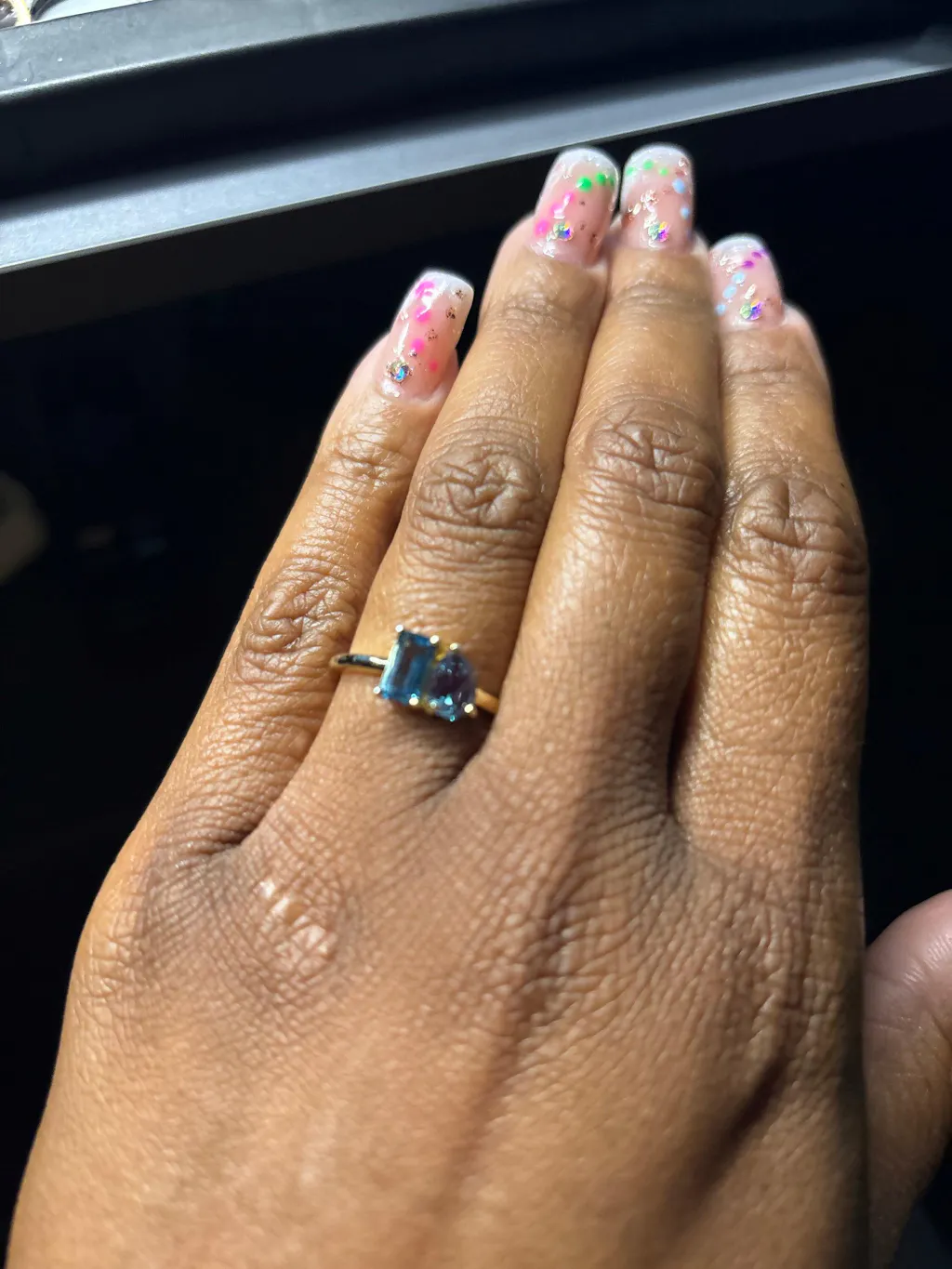 I love this ring!!! I have been looking for a ring to incorporate my birthstone and my daughter’s birthstone for a long time. This was the closest I could find without breaking my budget. The ring is beautiful and catches the light. I’ve get compliments on the ring every time I wear it. Plan to buy my daughter one in the near future.