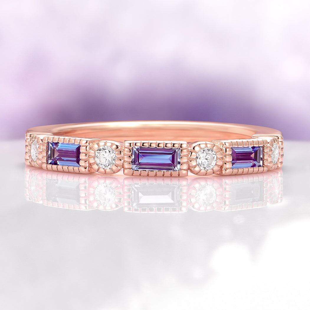 This gorgeous vintage-inspired Alexandrite ring captures timeless beauty with a touch of modern elegance. Crafted in 14K rose gold vermeil over 925 sterling silver, it features alternating lab-grown Alexandrite and cubic zirconiastones, creating a captivating play of color and sparkle.