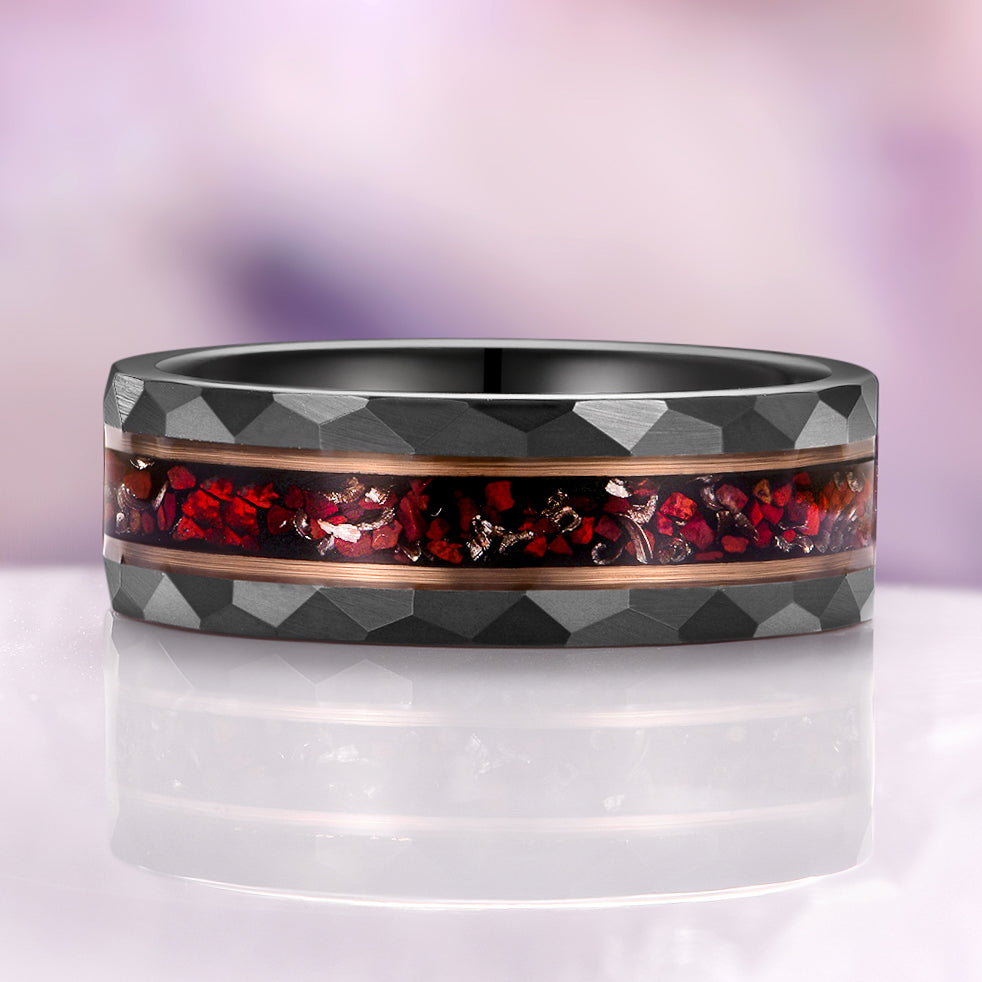 Dinosaur Bone & Meteorite Hammered Wedding Band in Black/Rose Gold Tungsten Carbide (8mm)