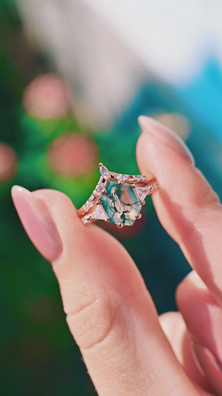 Crafted in 14K rose gold over solid 925 sterling silver, this vintage-inspired ring set combines timeless elegance with the earthy beauty of natural moss agate. Perfect as an engagement ring, promise ring, birthstone ring, or statement piece, it makes a meaningful and enchanting addition to any jewelry collection.