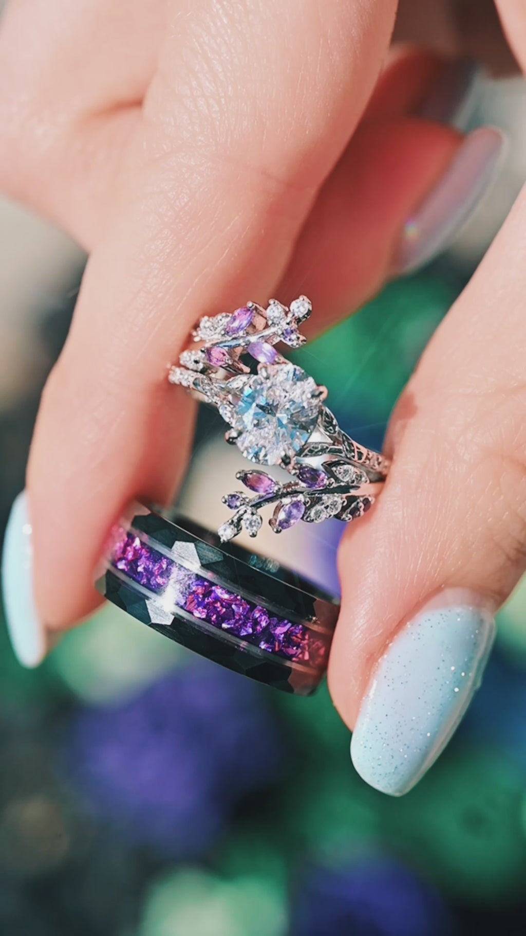 Simulated Diamond & Amethyst Leaf Couples Ring Set