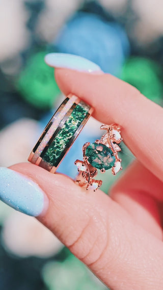 ►For the men's ring, we present a green moss agate & white fire opal in a rose gold-filled tungsten carbide band. The durable and scratch-resistant tungsten carbide ensures a lasting symbol of your bond, while the fiery red opal adds a distinctive flair. The combination of strength and style makes his ring a perfect complement to the set.