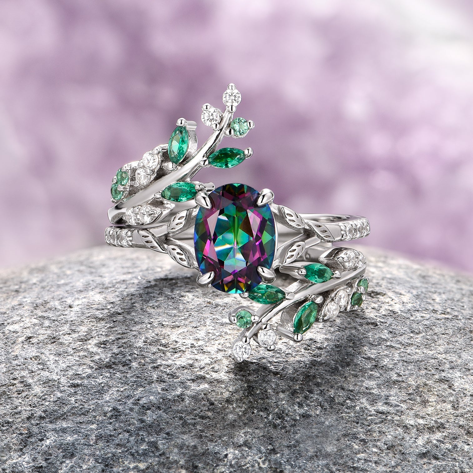 A stunning sterling silver band featuring a vibrant Mystic Topaz gemstone, renowned for its mesmerizing, ever-changing rainbow hues. The delicate leaf motifs, accented with shimmering emerald stones, evoke the beauty of a blooming forest, symbolizing growth, love, and new beginnings.