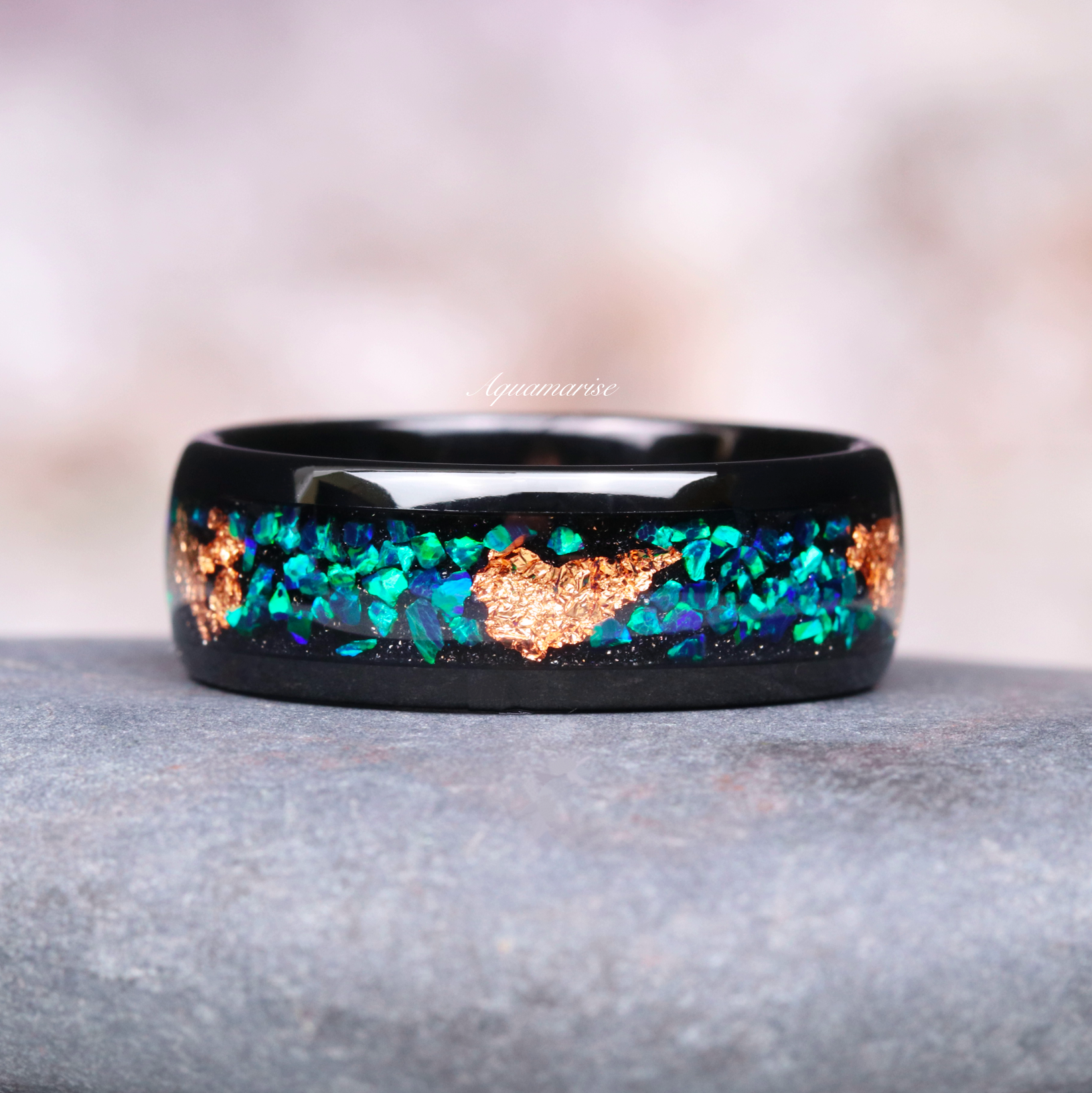 Peacock Fire Opal & Rose Gold Leaf Couples Ring Set
