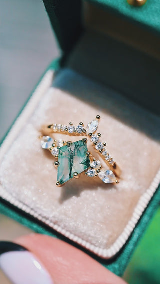 Vintage-Inspired Moss Agate Engagement Ring Set in 14K Yellow Gold Vermeil – Natural Kite Cut Moss Agate Promise Ring – Unique Statement Ring for Her