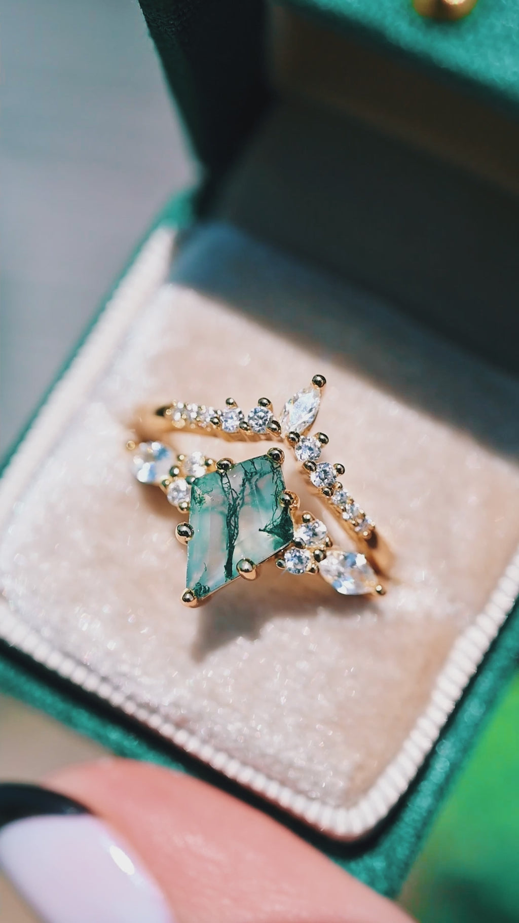 ►Make a bold yet elegant statement with this vintage-inspired moss agate ring set, crafted in solid 925 sterling silver and finished in rich 14K yellow gold vermeil. Designed to celebrate your love story or personal journey, this nature-infused ring is perfect as an engagement ring, promise ring, or meaningful birthstone piece.