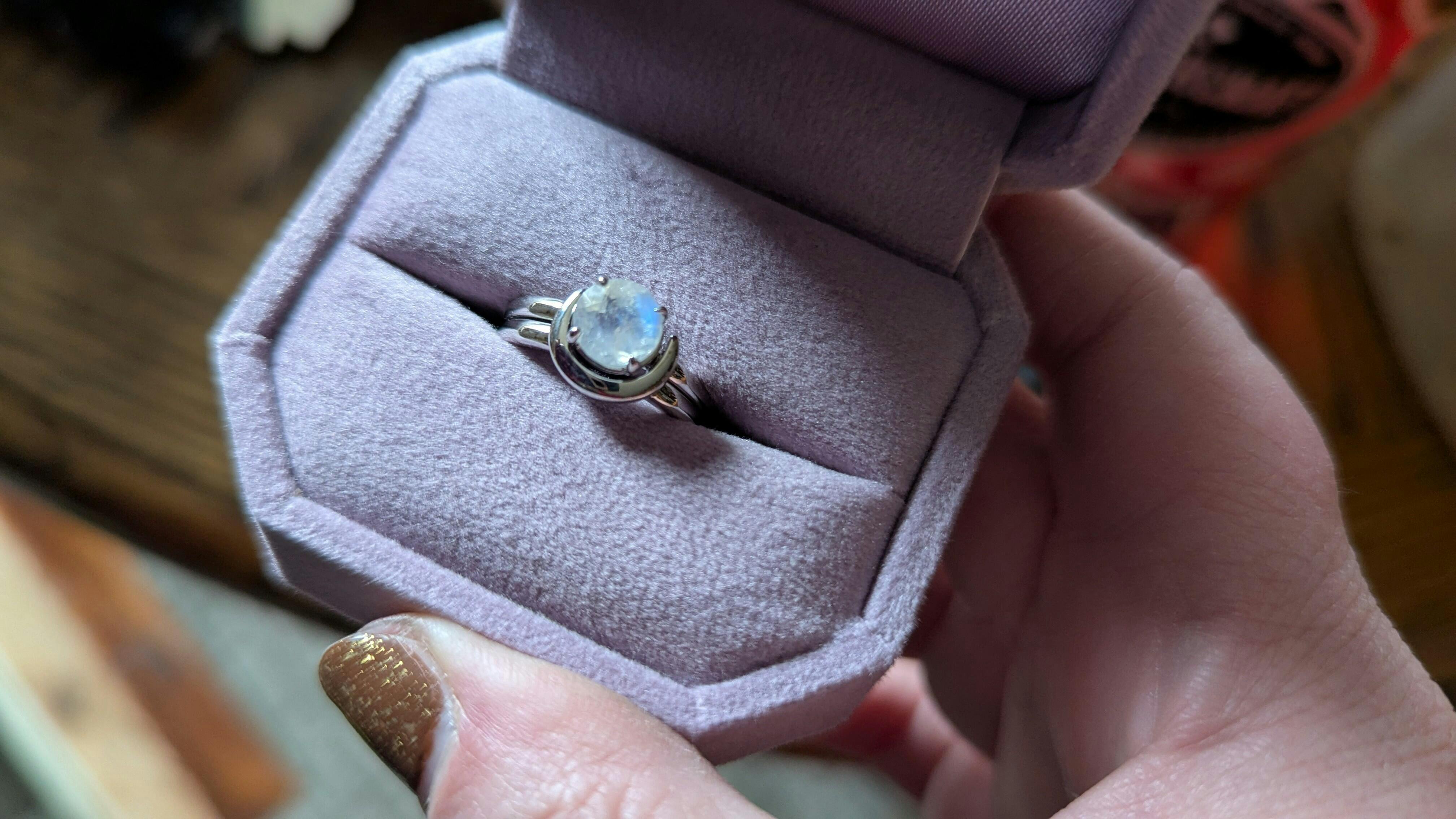 I loved the simple design and affordable price of this ring set. The blue flash of the moonstone is prettier in person. How wonderful to have an option that symbolizes my relationship so perfectly that doesn't break the bank.