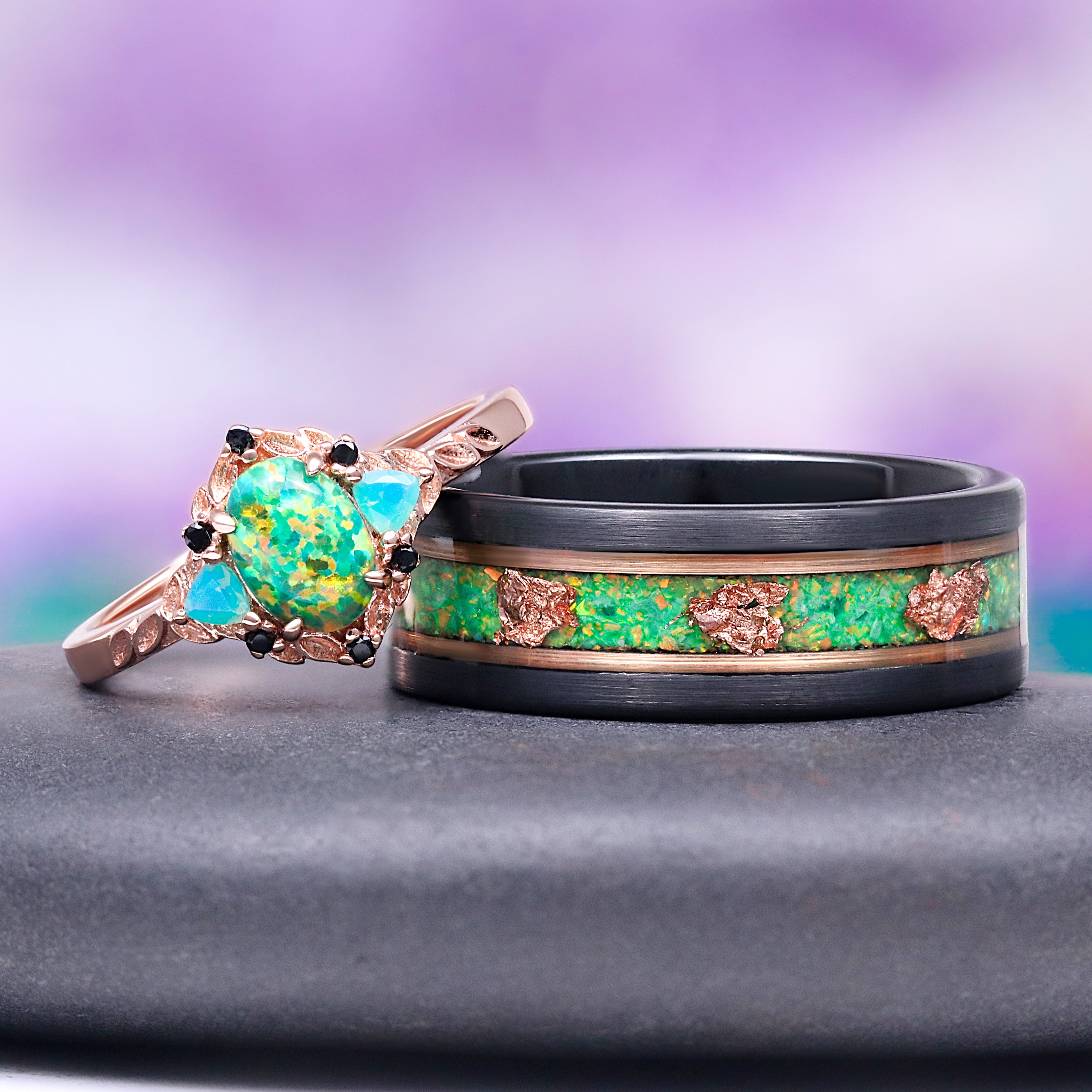 The matching men’s band radiates power and sophistication. Crafted from two-tone tungsten carbide, it features a vivid crushed Green Fire Opal inlay accented with rose gold leaf details. The result is a bold, modern design that mirrors strength, balance, and eternal loyalty.