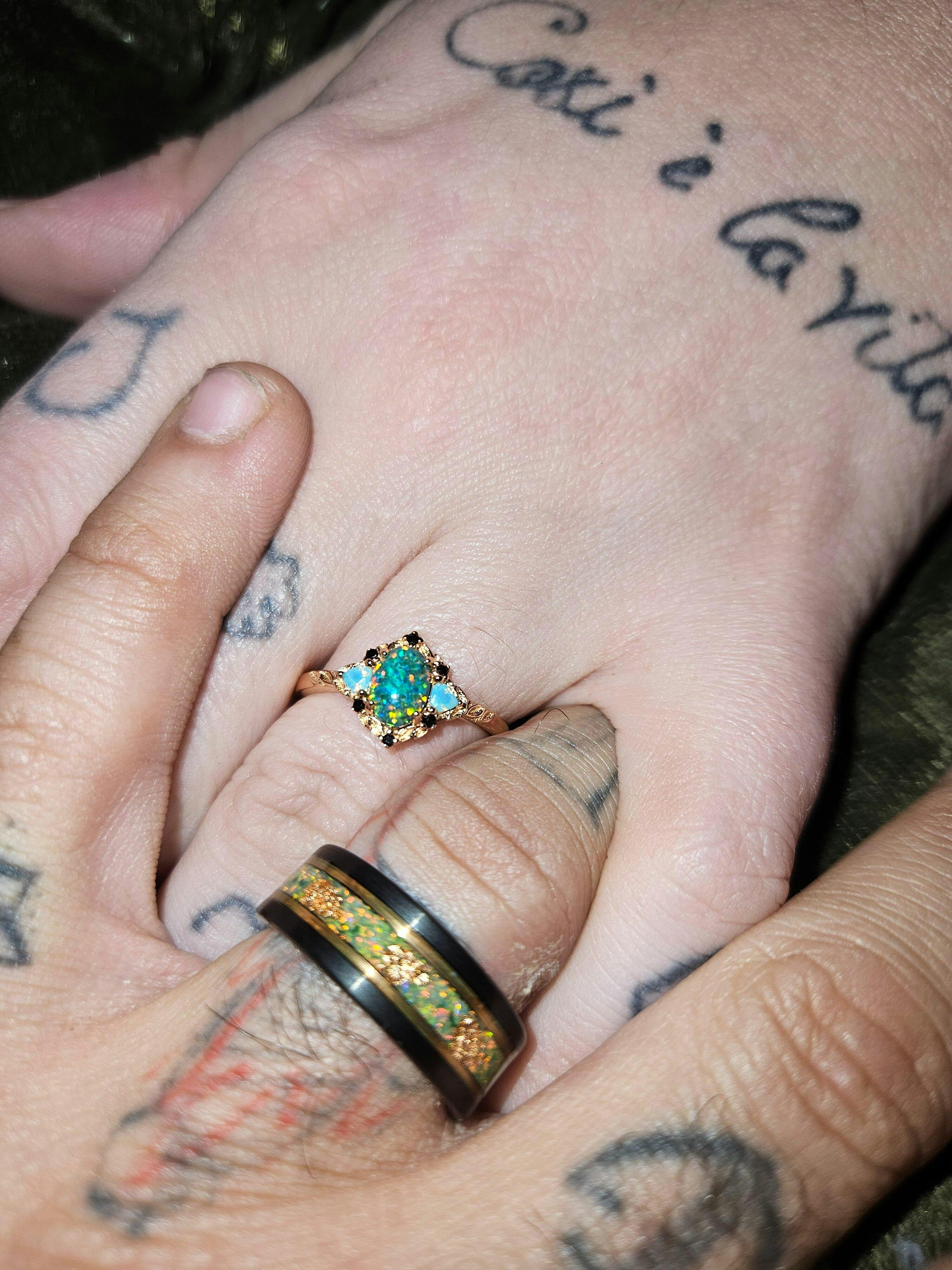 The Ring of Eldoria™ Couples Set captures the essence of myth and devotion. From the fiery glow of its opal to the intricate rose-gold leaf detailing, every element symbolizes a love that’s both powerful and eternal.
