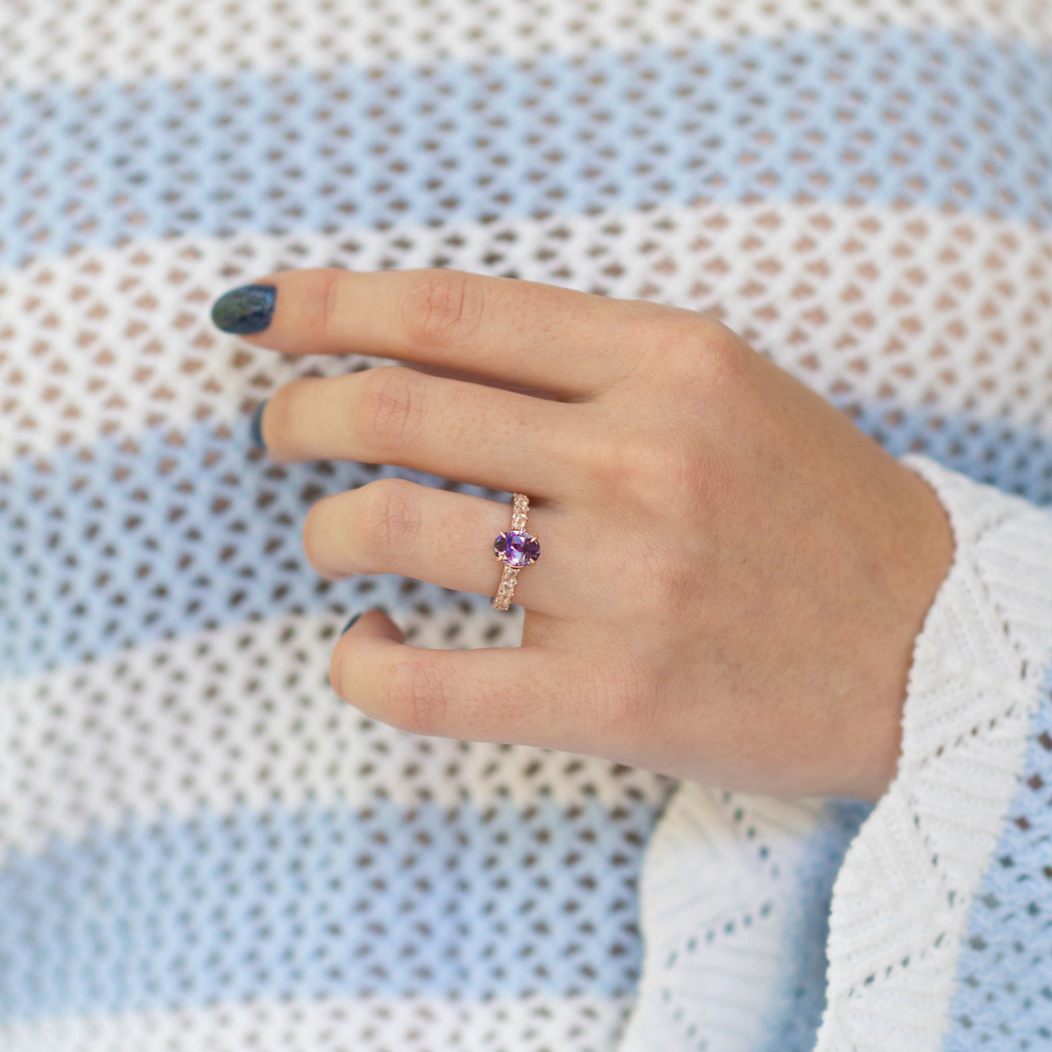 This stunning Oval Alexandrite Ring is crafted in 14K rose gold vermeil over solid 925 sterling silver, featuring a mesmerizing lab-grown alexandrite center stone known for its magical color shift. With hues of deep purple and green that change under different lighting, this ring makes a one-of-a-kind statement—perfect for engagements, promise rings, anniversaries, or meaningful birthday gifts for someone special born in June.