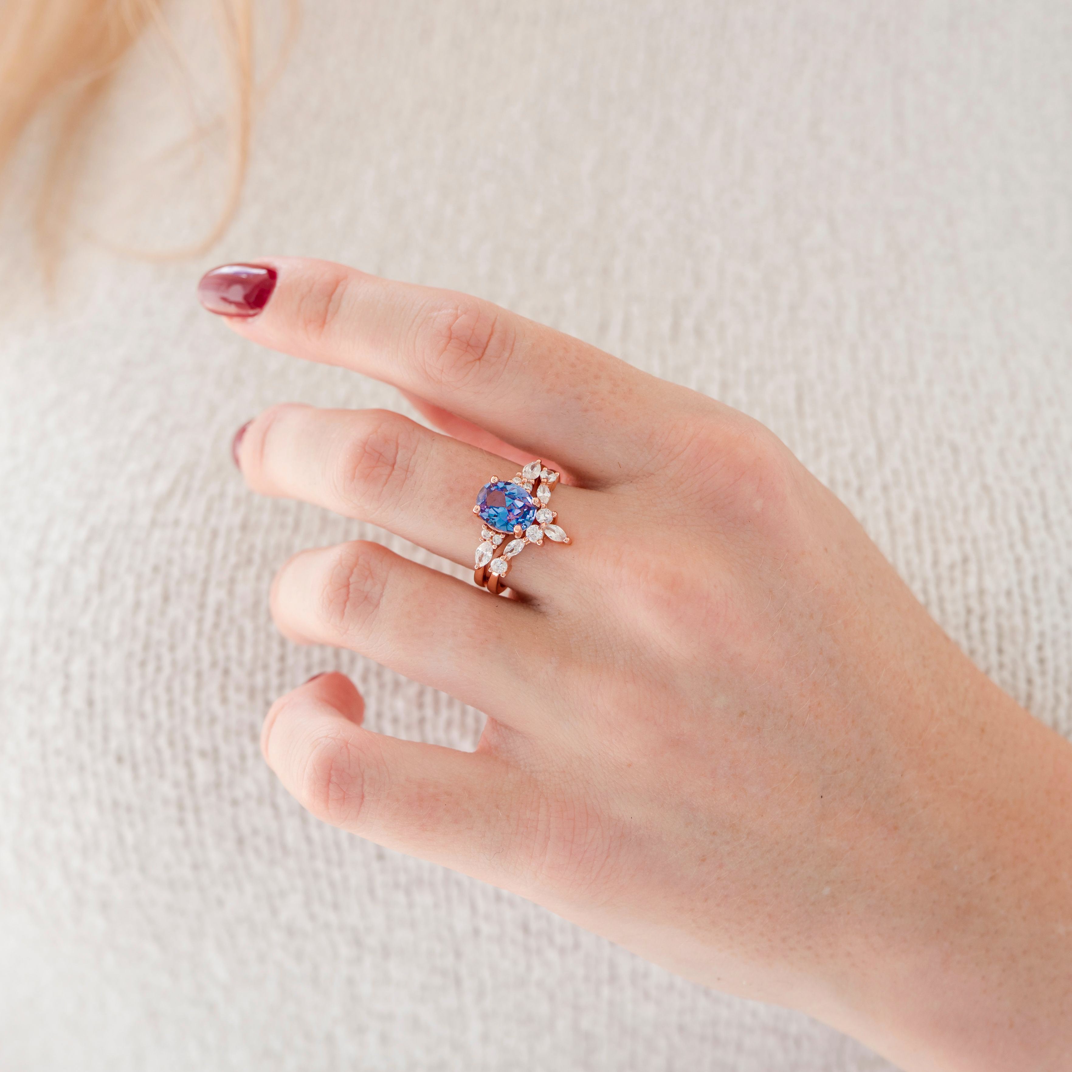 Make an unforgettable statement with this vintage inspired Alexandrite ring set, crafted in 14K rose gold over solid 925 sterling silver. Its timeless elegance and enchanting color-changing gemstone make it a perfect choice as an engagement ring, promise ring, birthstone ring, or statement piece.