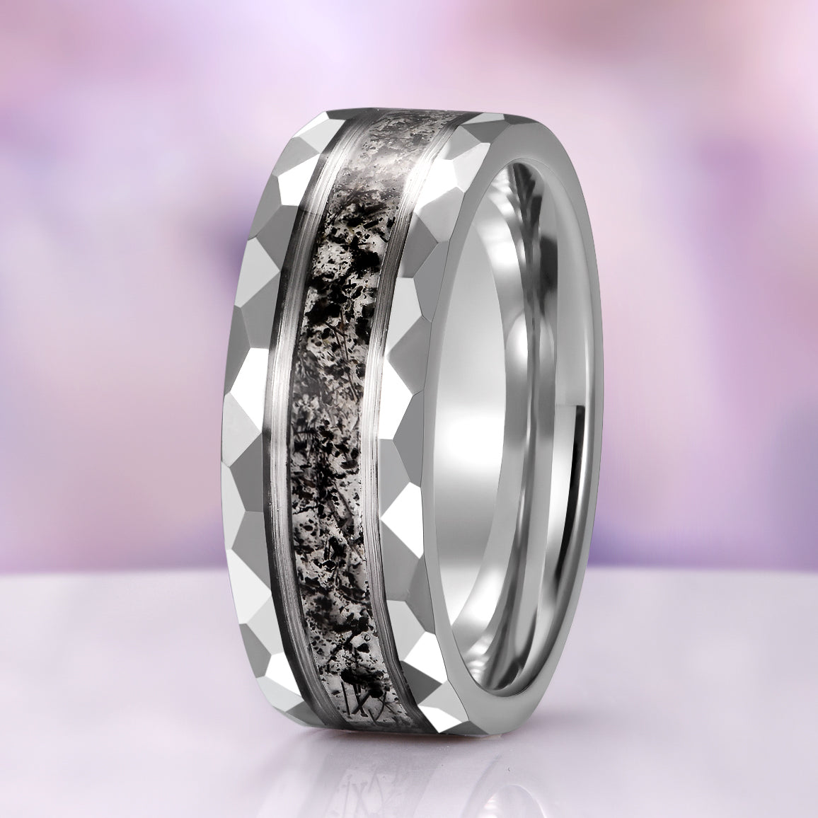 ►His ring is Polished and Hammered Tungsten Carbide with Crushed Rutilated Quartz