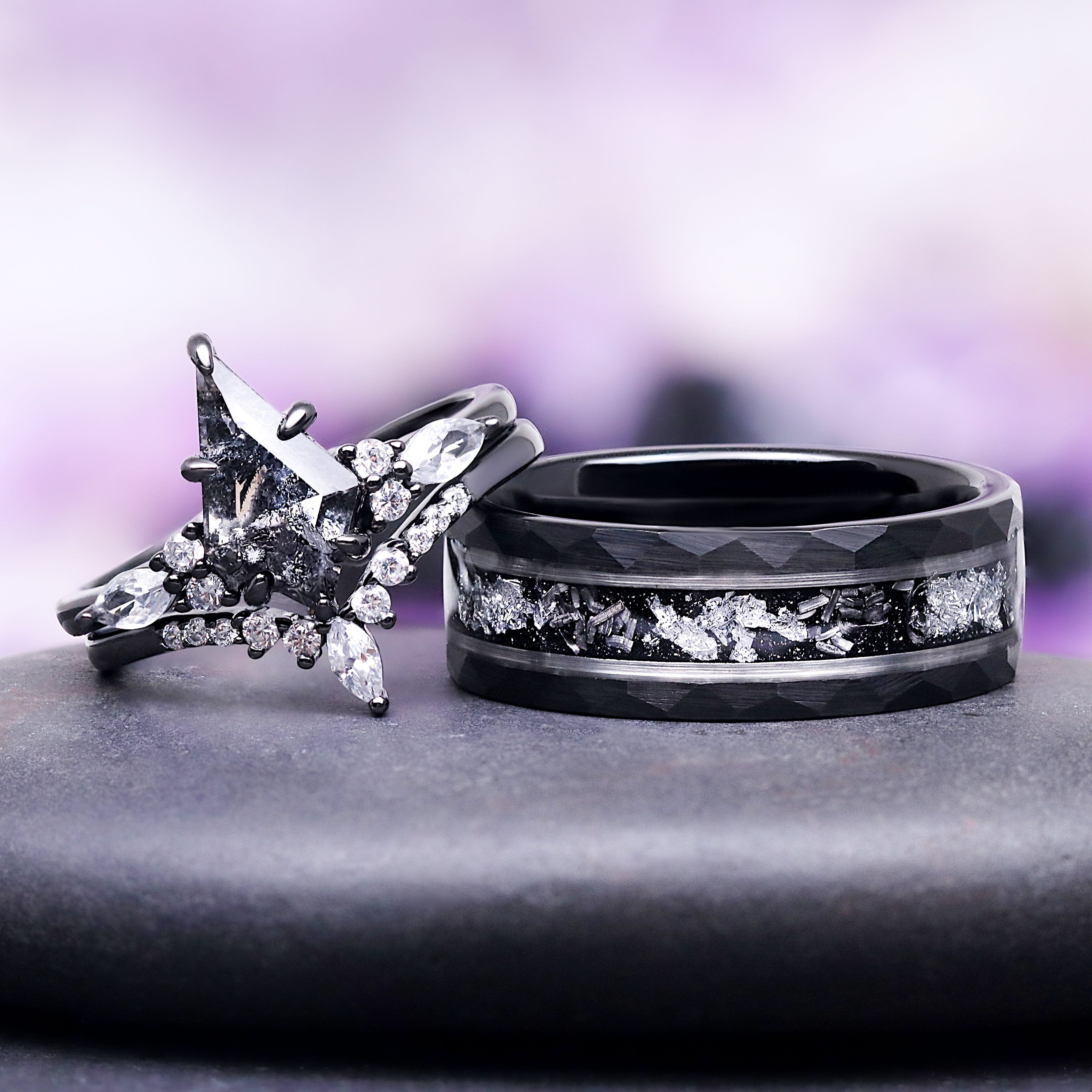 An art deco Skye Kite® cut natural Herkimer diamond ring set in 925 solid sterling silver with a black ruthenium finish beautifully captures the essence of cosmic sophistication. This captivating design combines the raw beauty of nature with a modern edge, making it a perfect choice for those who appreciate unique, meaningful jewelry.