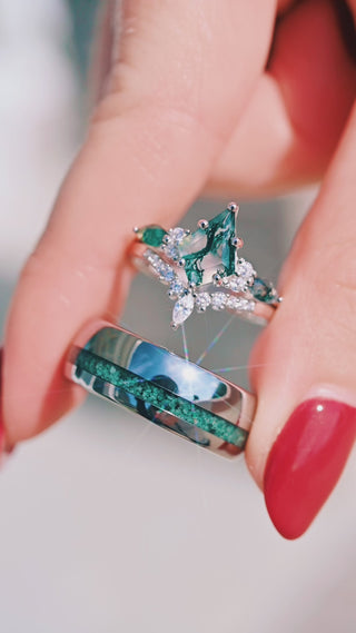 Celebrate your love story with the Kite Green Moss Agate His and Hers Ring Set, a captivating blend of nature’s beauty and timeless craftsmanship. Designed for couples who share a deep connection with the natural world, this matching wedding band set perfectly symbolizes growth, renewal, and enduring devotion.