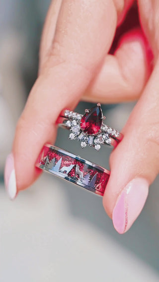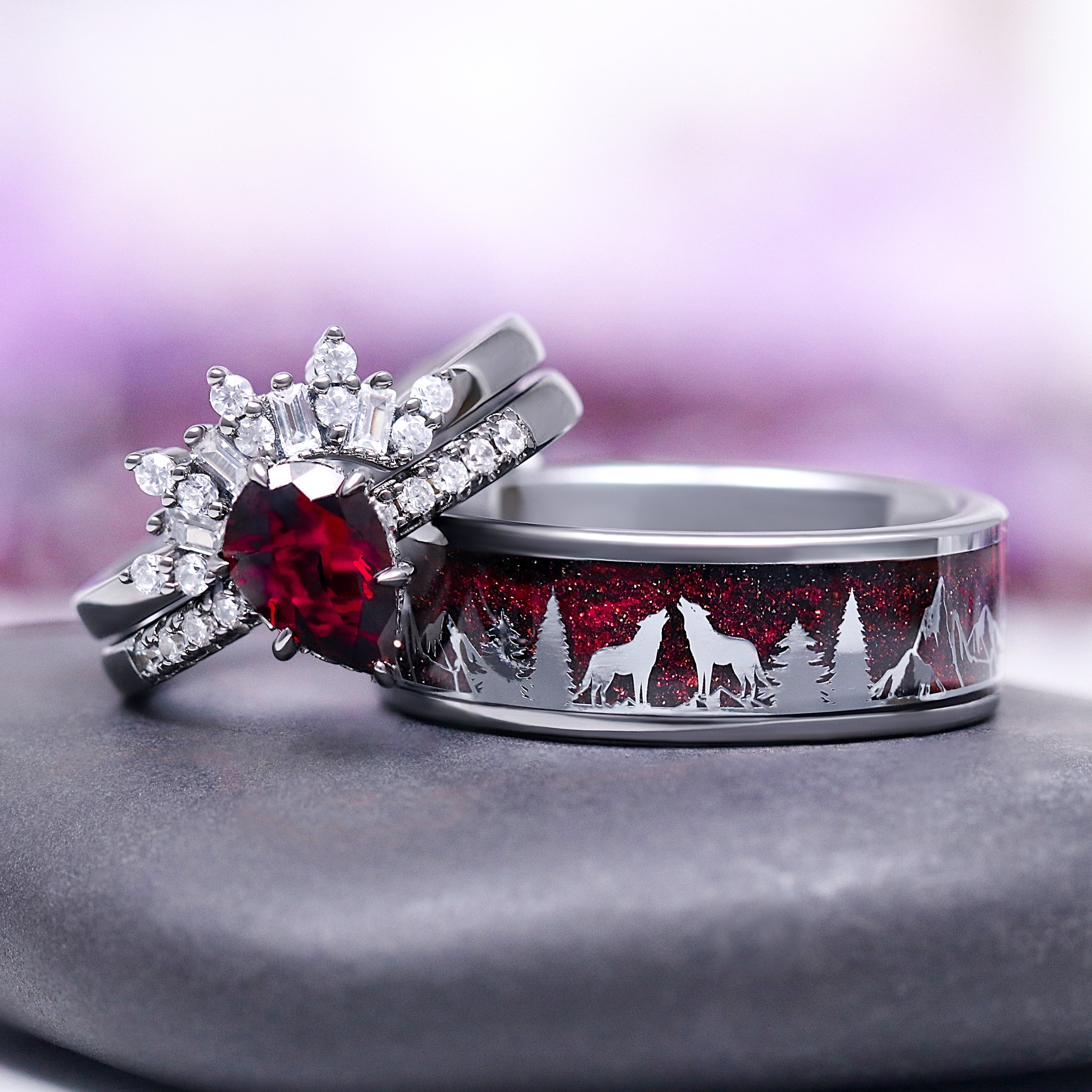 Art Deco Natural Red Garnet Ring Set- Black Ruthenium (Vampire Inspired)