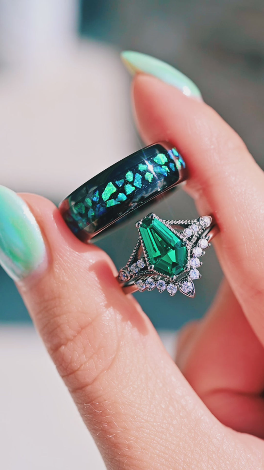 Make a bold, unforgettable statement with this hauntingly beautiful coffin cut emerald ring set. Crafted in solid 925 sterling silver and finished with a sleek black ruthenium plating, this gothic-inspired ring is the perfect alternative to traditional engagement or promise rings.
