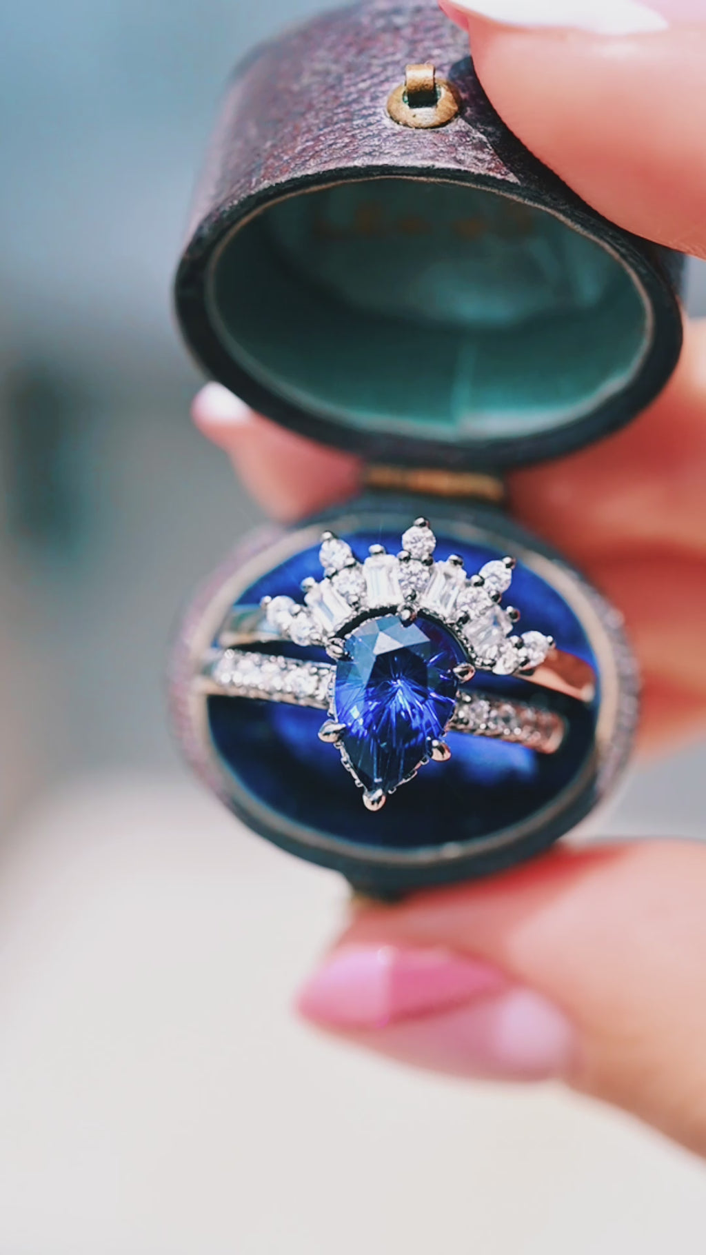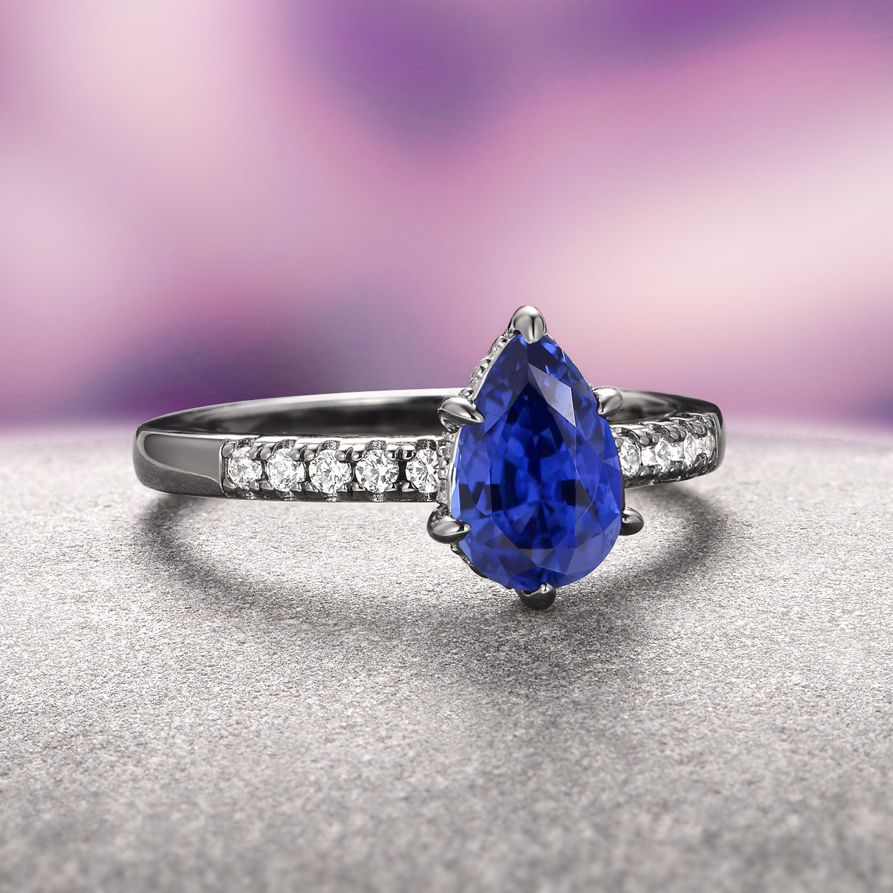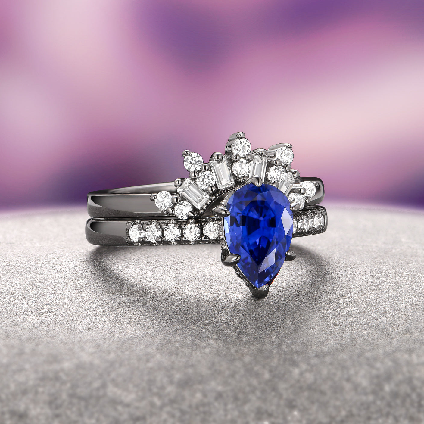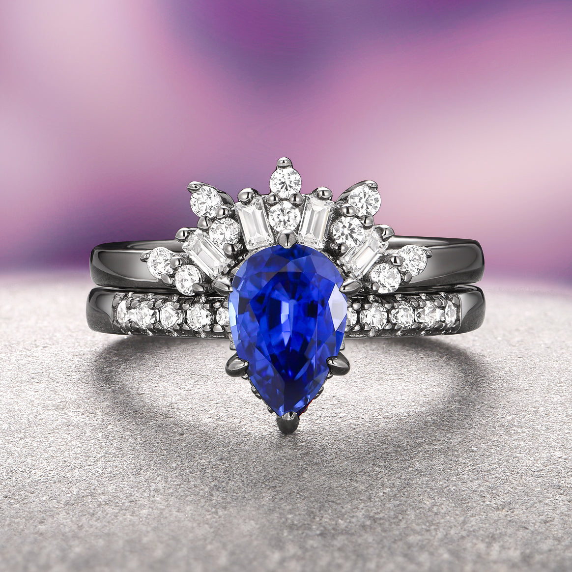 ► The centerpiece is a stunning pear-cut lab-grown blue sapphire, approximately 1.2 carats, symbolizing wisdom, loyalty, and truth. Its vivid blue hue shines brilliantly against the dramatic contrast of the black finish, making it an ideal September birthstone ring or alternative engagement ring.