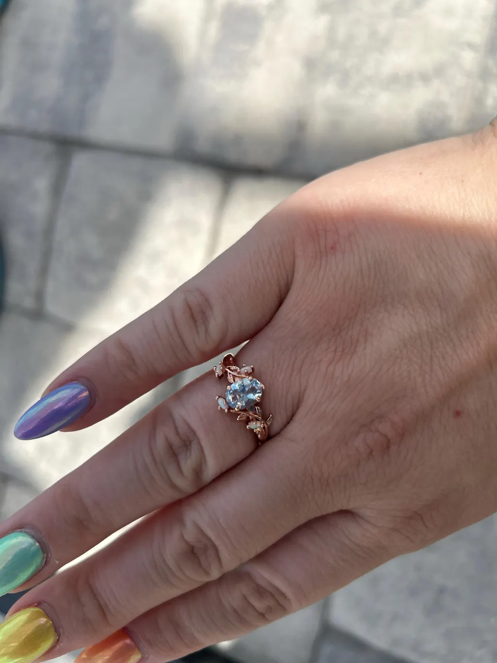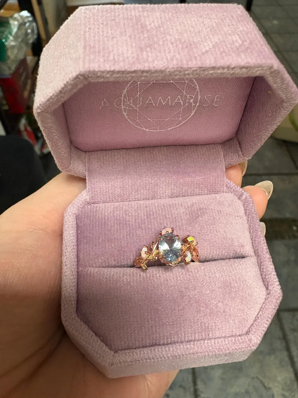 Aquamarine & Fire Opal Leaf Engagement Ring in 14K Rose Gold Vermeil