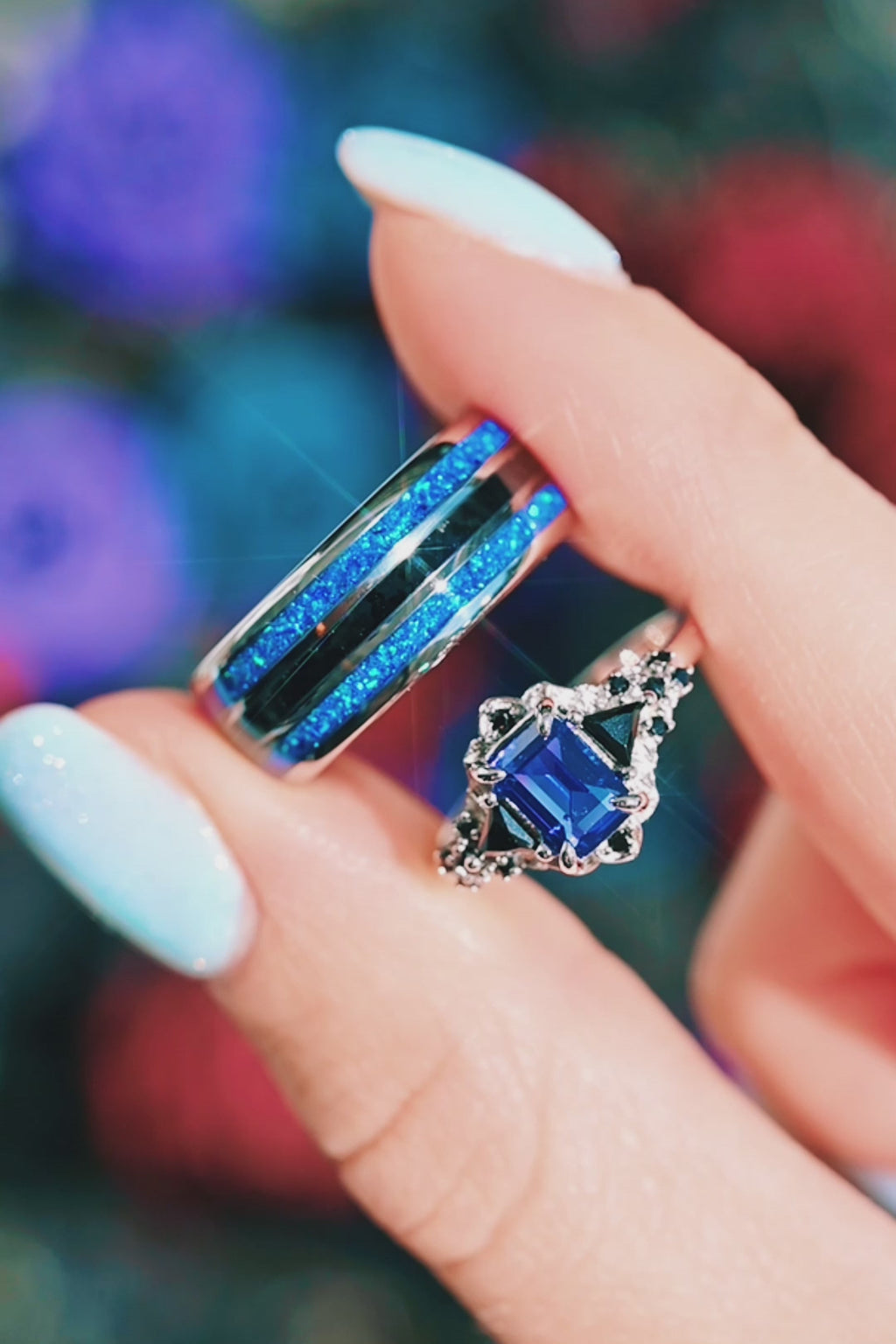 Blue Sapphire & Fire Opal Couples Ring Set