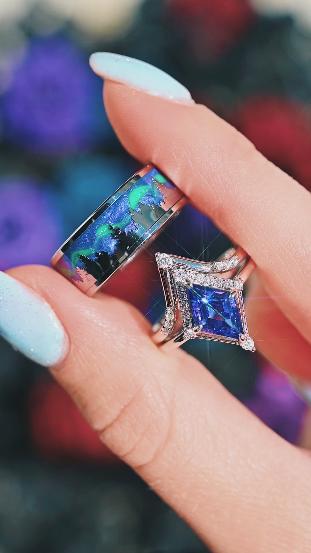 Borealis & Tanzanite Couples Ring Set- Northern Lights & Trees