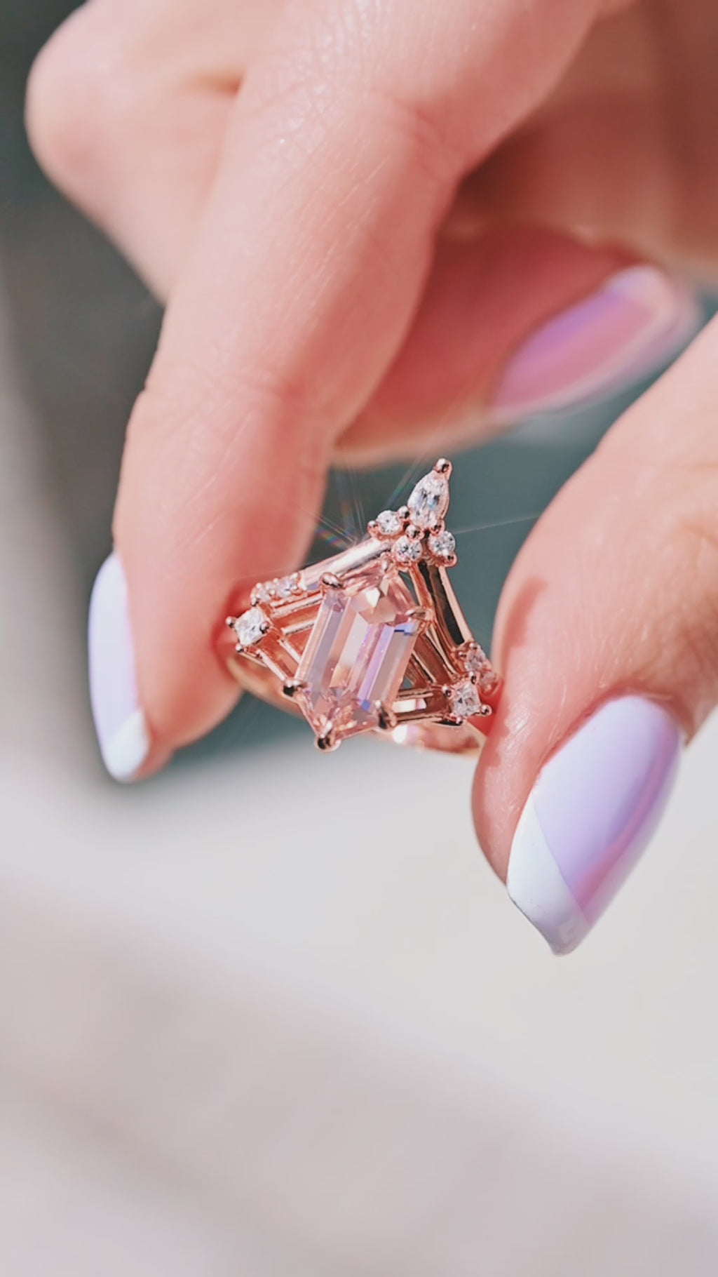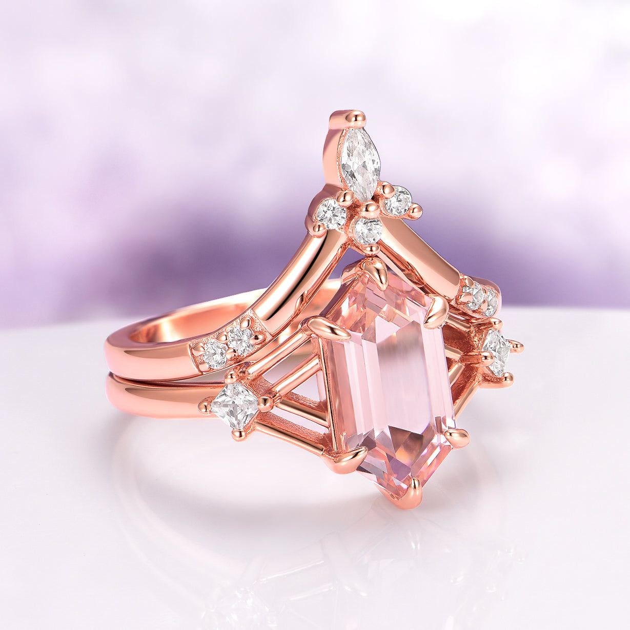 ►Crafted with the finest materials, this stunning piece seamlessly combines the delicate charm of pink morganite with the robust allure of rose gold tungsten, resulting in a timeless symbol of love and commitment.