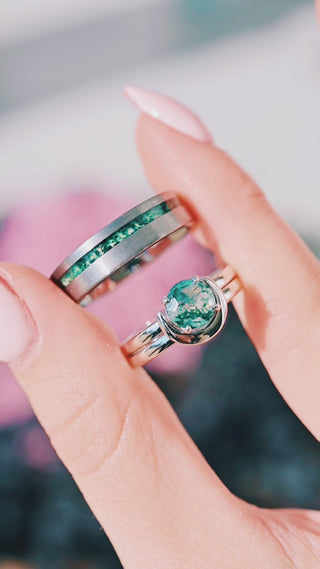 ►Whether you're exchanging vows or celebrating a promise, the Green Moss Agate Crescent Moon Couples Ring Set will remind you both of the endless universe of love you share