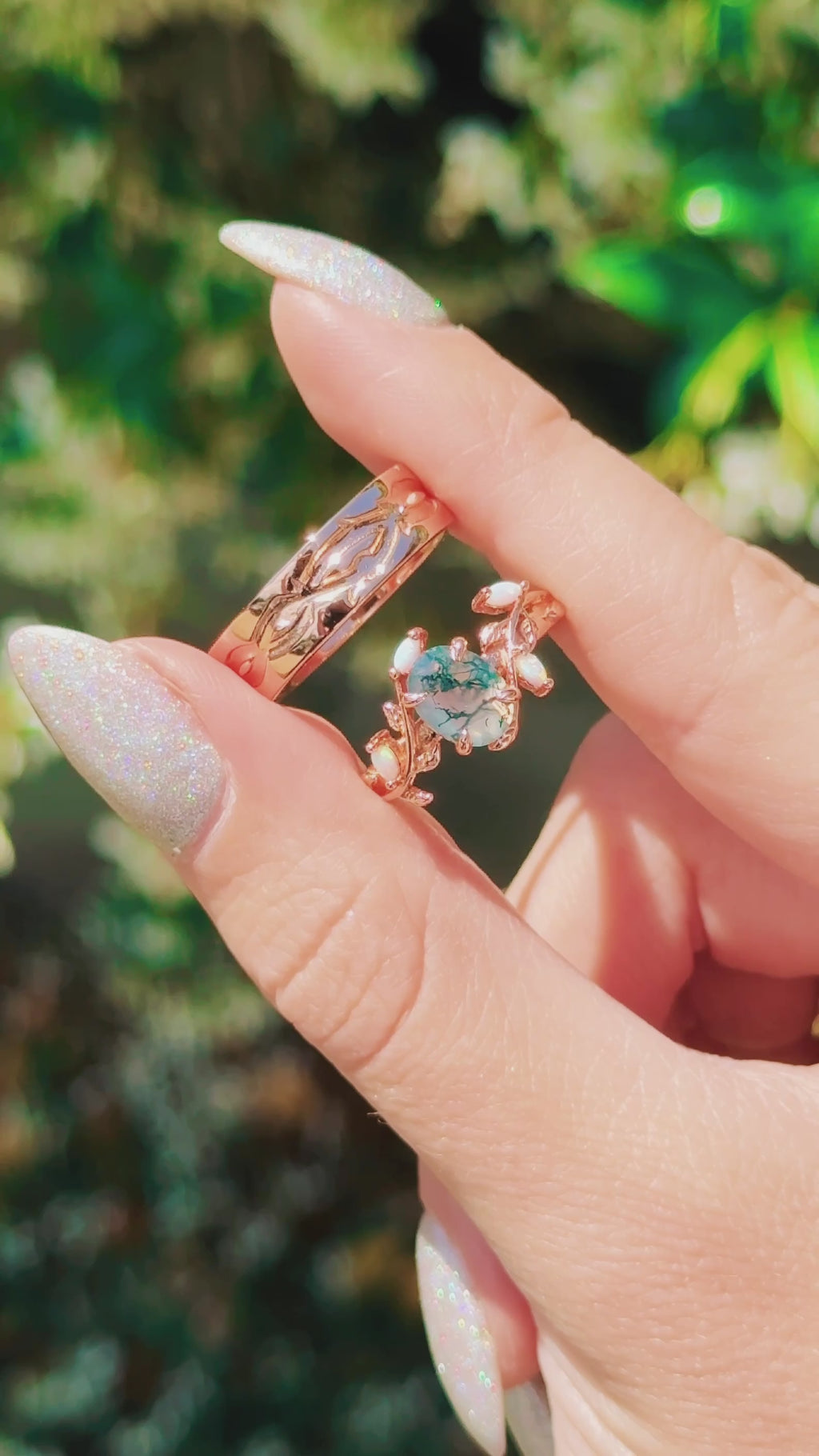 ►Immerse yourself in the ethereal beauty of the Green Moss Agate ring, a piece that encapsulates the essence of a lush forest floor. This exquisite ring features a Green Moss Agate gemstone, known for its calming energies and its resemblance to the tranquil moss-covered glades of nature. The stone is carefully set in a unique twisted vine and leaf design, creating an intricate and organic pattern that winds gracefully around the finger. The 14K Rose Gold Vermeil band complements the rich, earthy tones of the Green Moss Agate, adding warmth and a touch of elegance to the piece. This ring is a symbol of growth, renewal, and the enduring bond between two souls.