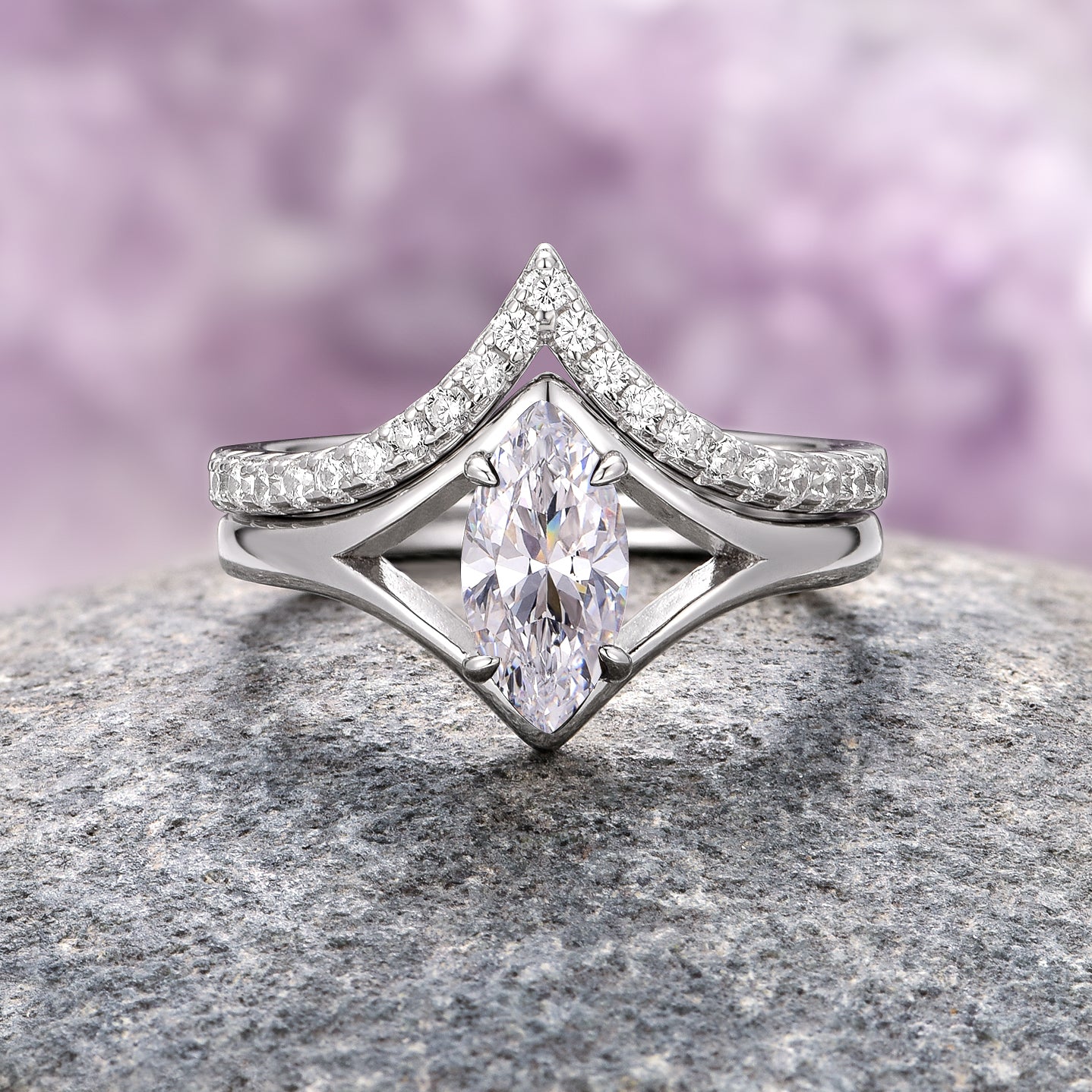 ►The women’s band showcases a delicate chevron V-shape adorned with a stunning marquise-cut cubic zirconia, offering a subtle yet sophisticated sparkle.