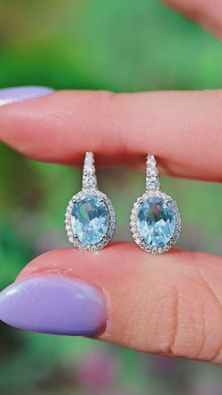 Elevate any look with the timeless elegance of these Aquamarine & Simulated Diamond Drop Earrings. Expertly crafted from solid 925 sterling silver, these earrings feature stunning lab-created aquamarine center stones in an oval cut, framed by a halo of sparkling simulated diamonds for maximum brilliance.