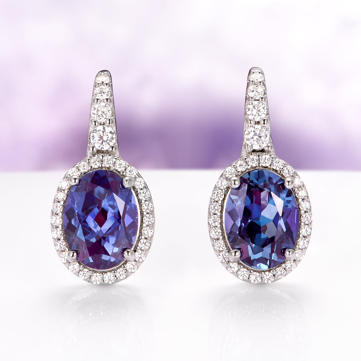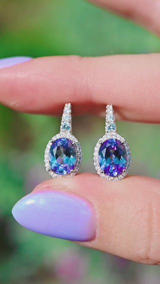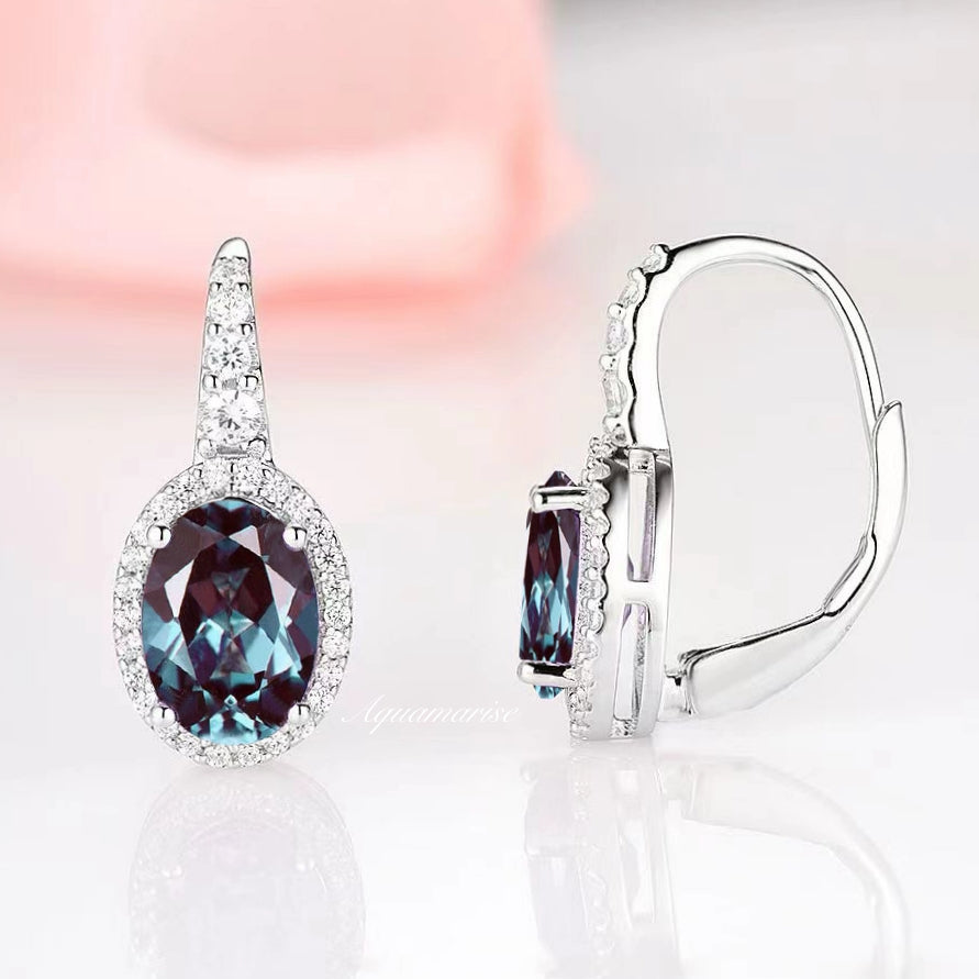 Add a magical touch to any occasion with these enchanting oval Alexandrite dangle earrings, designed to catch the light—and everyone's attention. Whether you're walking down the aisle or celebrating a special moment, these color-changing earrings shift from teal green to rich purple depending on the lighting, making them a truly unforgettable gift.