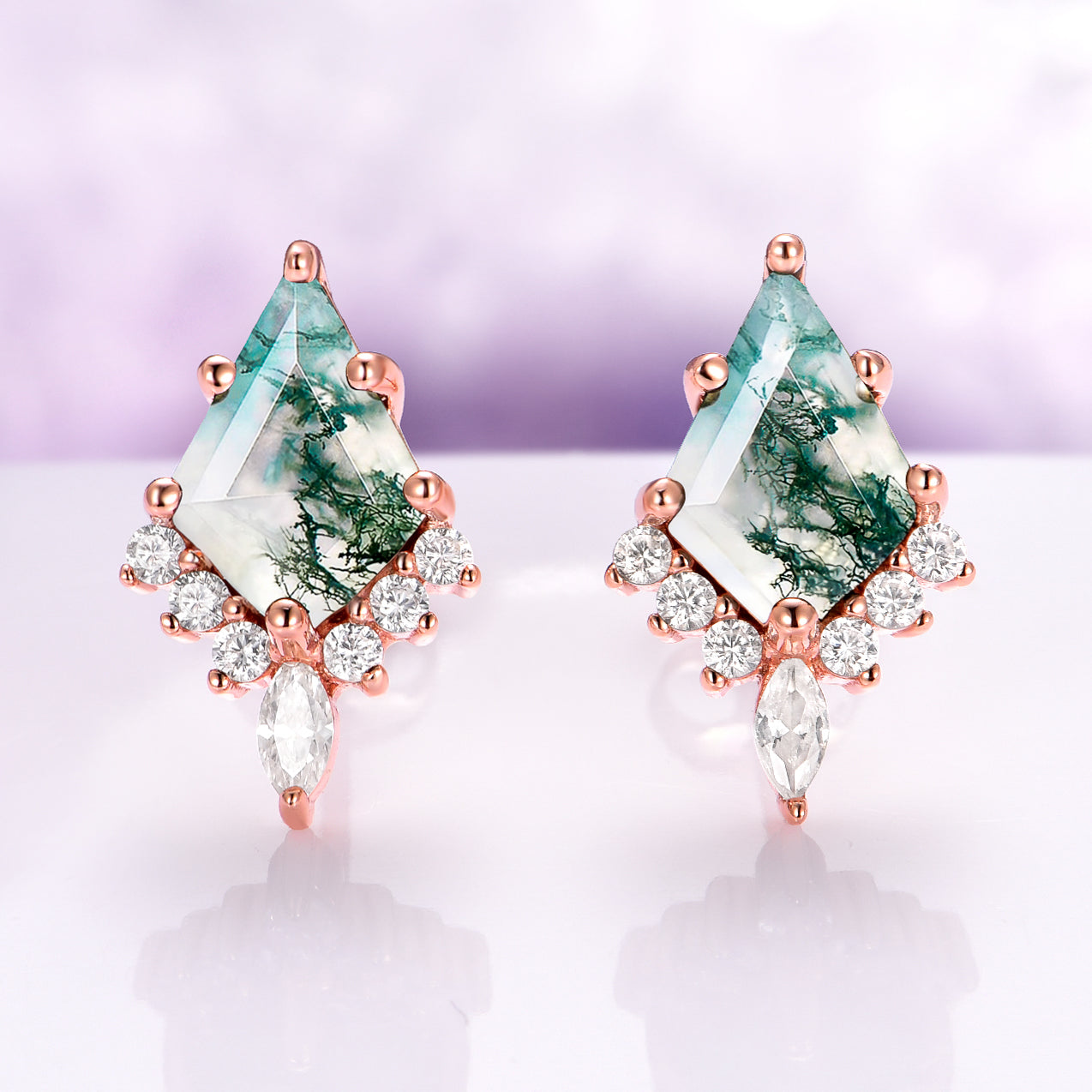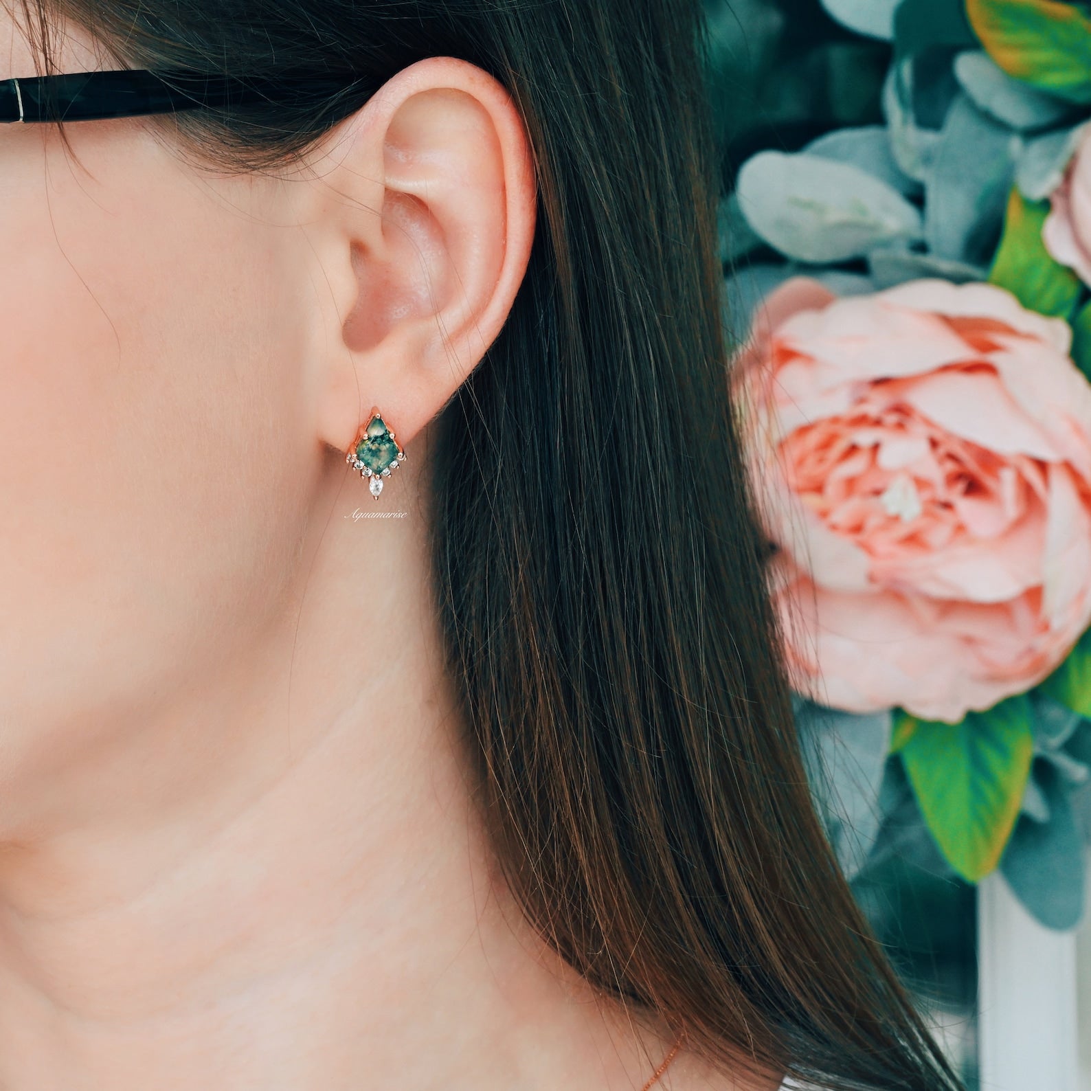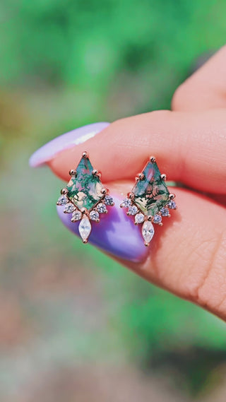 Elevate your jewelry collection with these vintage-inspired moss agate stud earrings, designed to bring a touch of timeless elegance and natural beauty. Featuring genuine green moss agate in a unique kite cut, these earrings are accented with sparkling simulated diamonds (CZ) for a refined yet enchanting look. Perfect as an everyday statement or as a meaningful gift, they embody elegance, symbolism, and individuality.