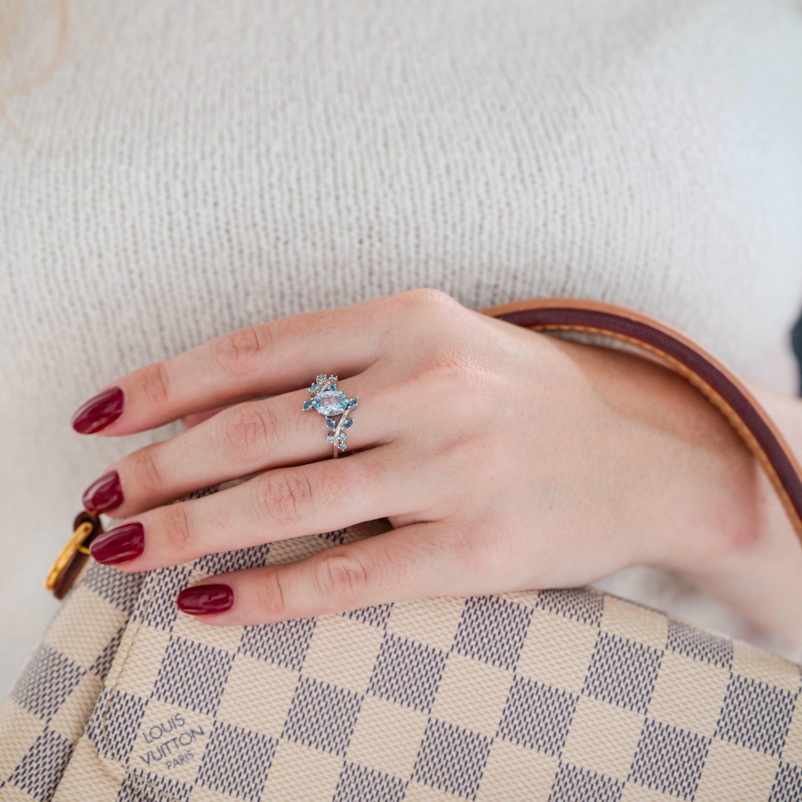 Introducing the Aquamarine Leaf Ring, a delicate creation inspired by nature’s beauty. This enchanting piece is crafted from 925 sterling silver and features a captivating ice-blue aquamarine gemstone, symbolizing serenity and purity. The intricate leaf design wraps around the stone, evoking the ethereal charm of a fairy tale forest. Ideal as a unique engagement ring, promise ring, or a thoughtful anniversary gift for her, this ring is perfect for women who appreciate the magic of nature and the elegance of timeless design. A truly one-of-a-kind piece that she’ll treasure forever.