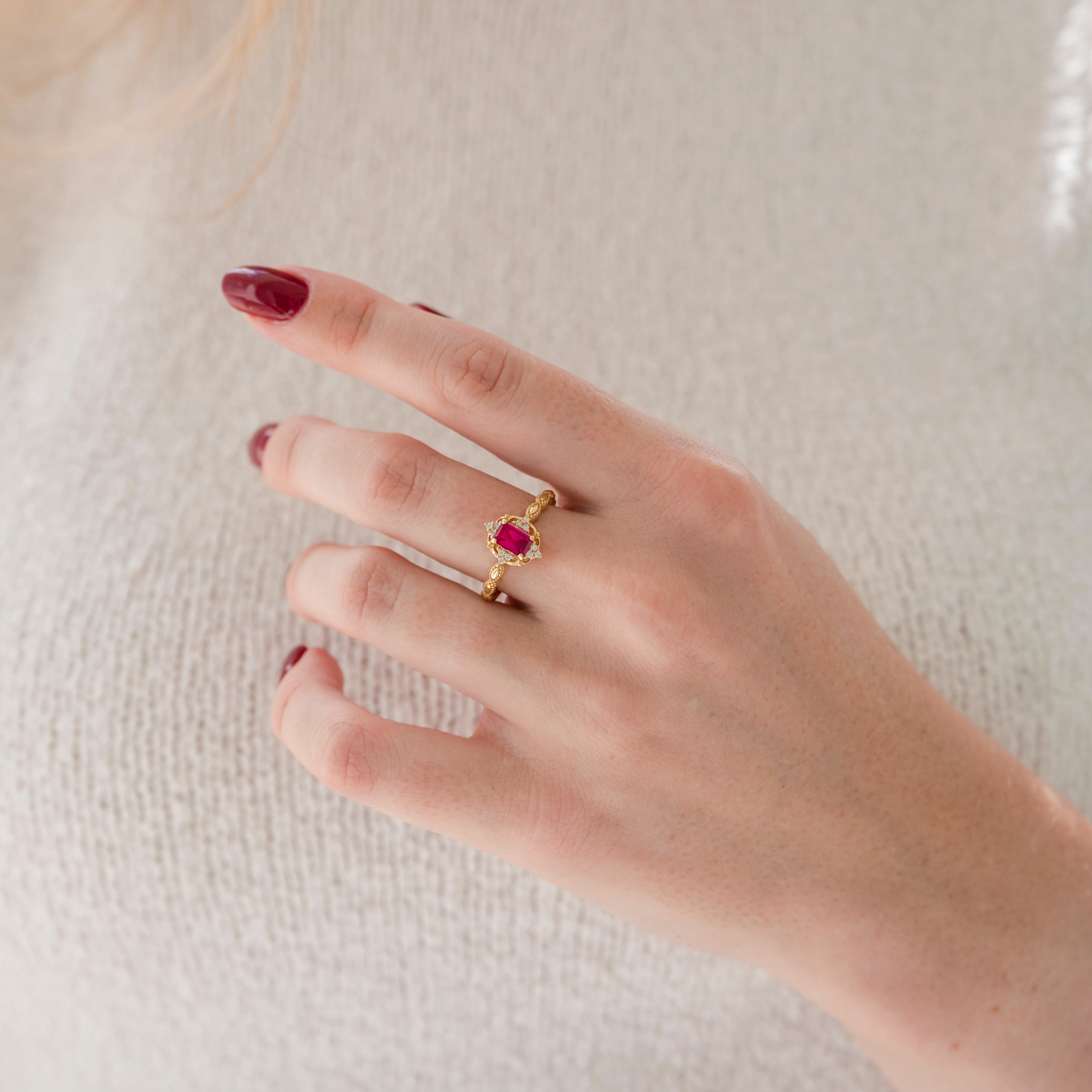 ► Metal Type: 14K Solid Yellow Gold ► Metal Options: Also available in 14K white gold or 14K rose gold upon request. Upgrade to 18K gold available for an additional cost. ► Center Gemstone: Ruby (Lab-Grown, AAA Grade) ► Cut: Emerald ► Gem Size: 6.0 × 4.0 mm ► Approx. Carat Weight: 1 ct