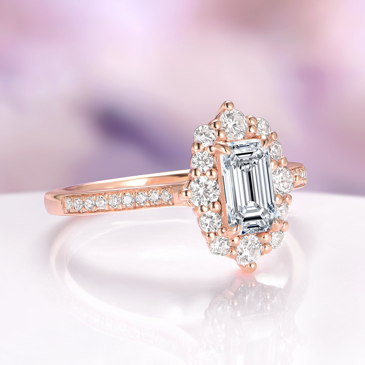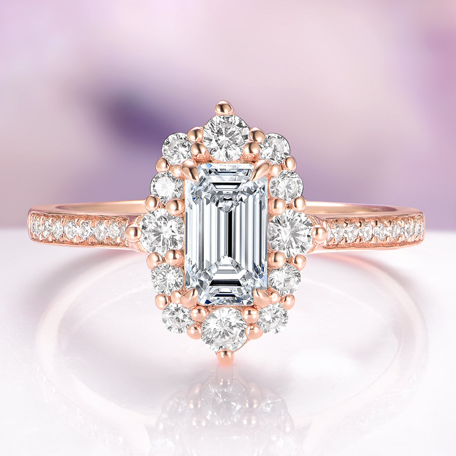 This romantic engagement ring captures timeless beauty with a modern, ethical touch. Shimmering scalloped pavé lab-grown diamonds extend halfway around the 14K rose gold band, while a diamond-encrusted gallery adds breathtaking brilliance from every angle. The emerald-cut lab-grown diamond center stone exudes sophistication and warmth—perfect for the bride who loves classic design infused with contemporary craftsmanship and rosy-hued elegance.