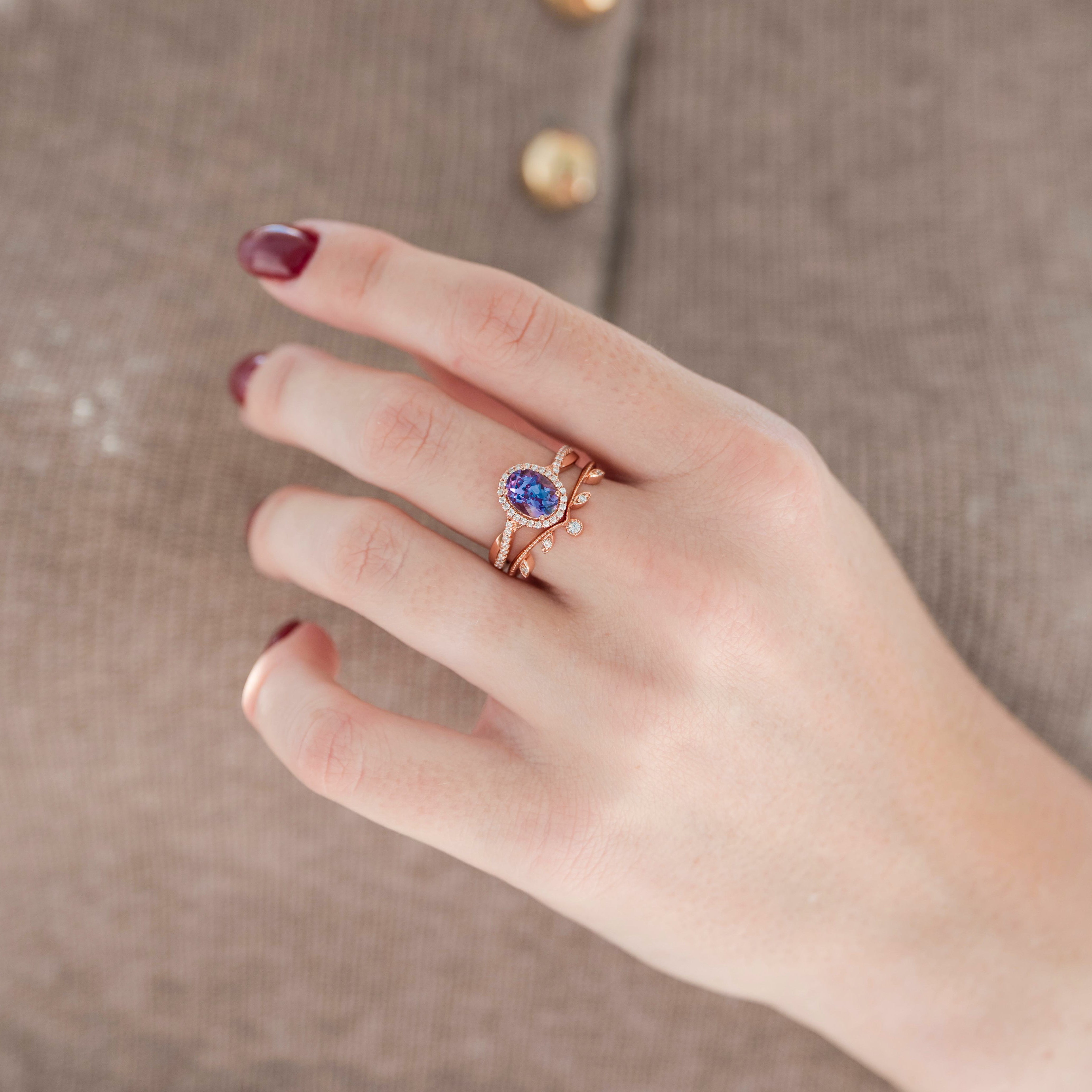 Gorgeous and enchanting, this twisted vine halo alexandrite ring set is crafted in 14K rose gold over 925 solid sterling silver, featuring a nature-inspired leaf design that brings a touch of magic to any occasion. Perfect as an engagement ring, promise ring, birthstone jewelry, or statement piece, this set blends timeless elegance with whimsical charm.