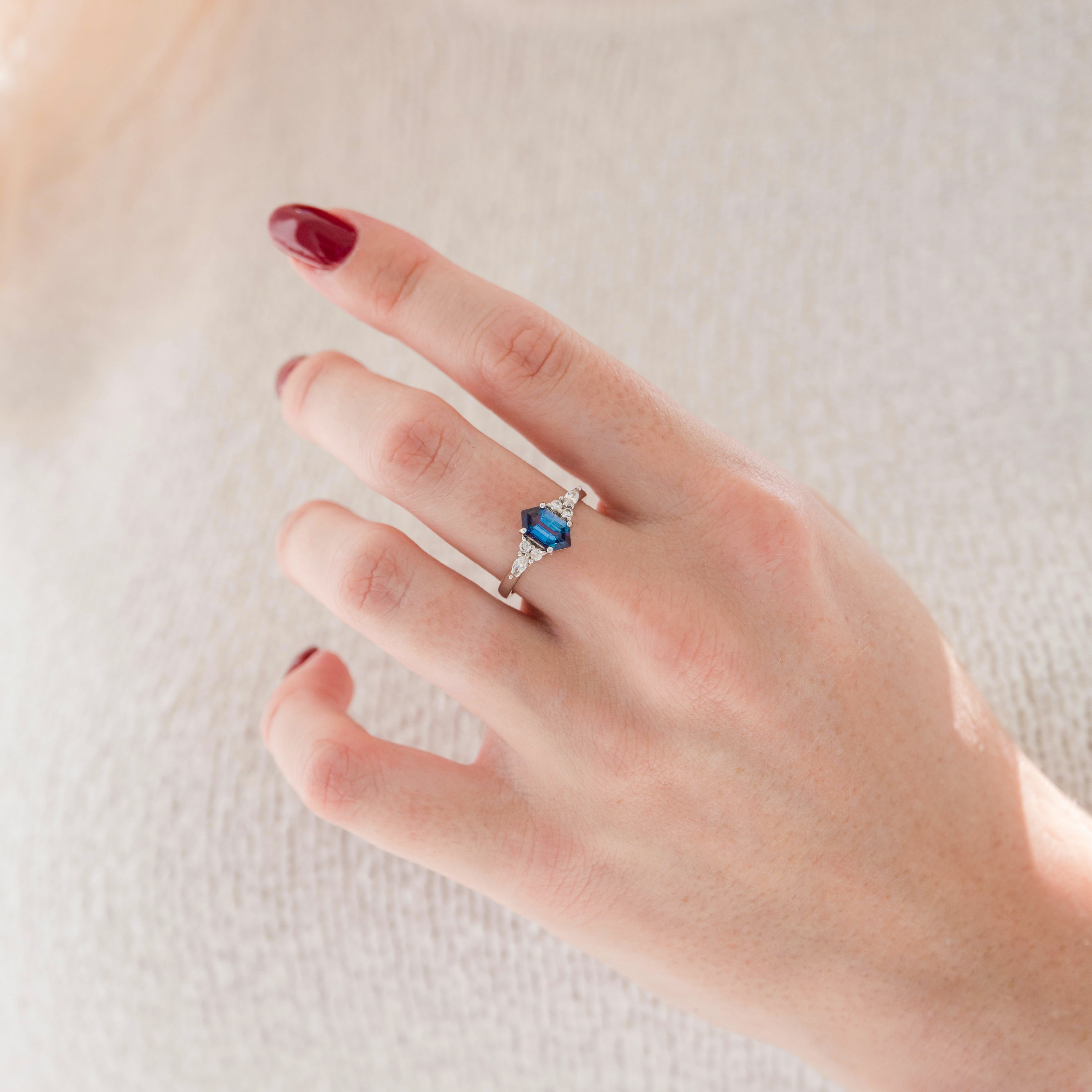 Introducing the Sonnet Hexagon Alexandrite Engagement Ring, a bold and enchanting design that blends modern elegance with timeless charm. Handcrafted in solid 14K white gold, this heirloom-quality ring showcases a striking hexagon-cut lab-grown alexandrite, celebrated for its extraordinary color-changing properties that shift between teal, violet, and magenta hues under different lighting. The center stone is framed by your choice of sparkling moissanite or natural diamonds, adding brilliance and depth to its geometric form. With its clean lines and distinctive silhouette, this ring is a remarkable choice for an engagement ring or a meaningful promise ring.