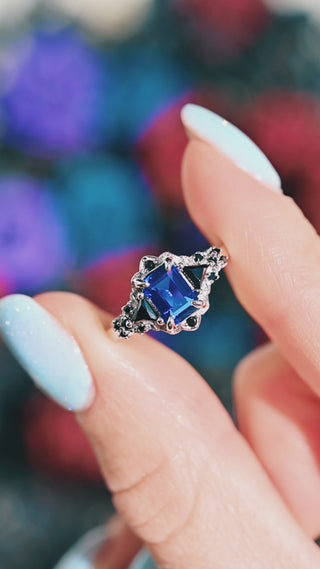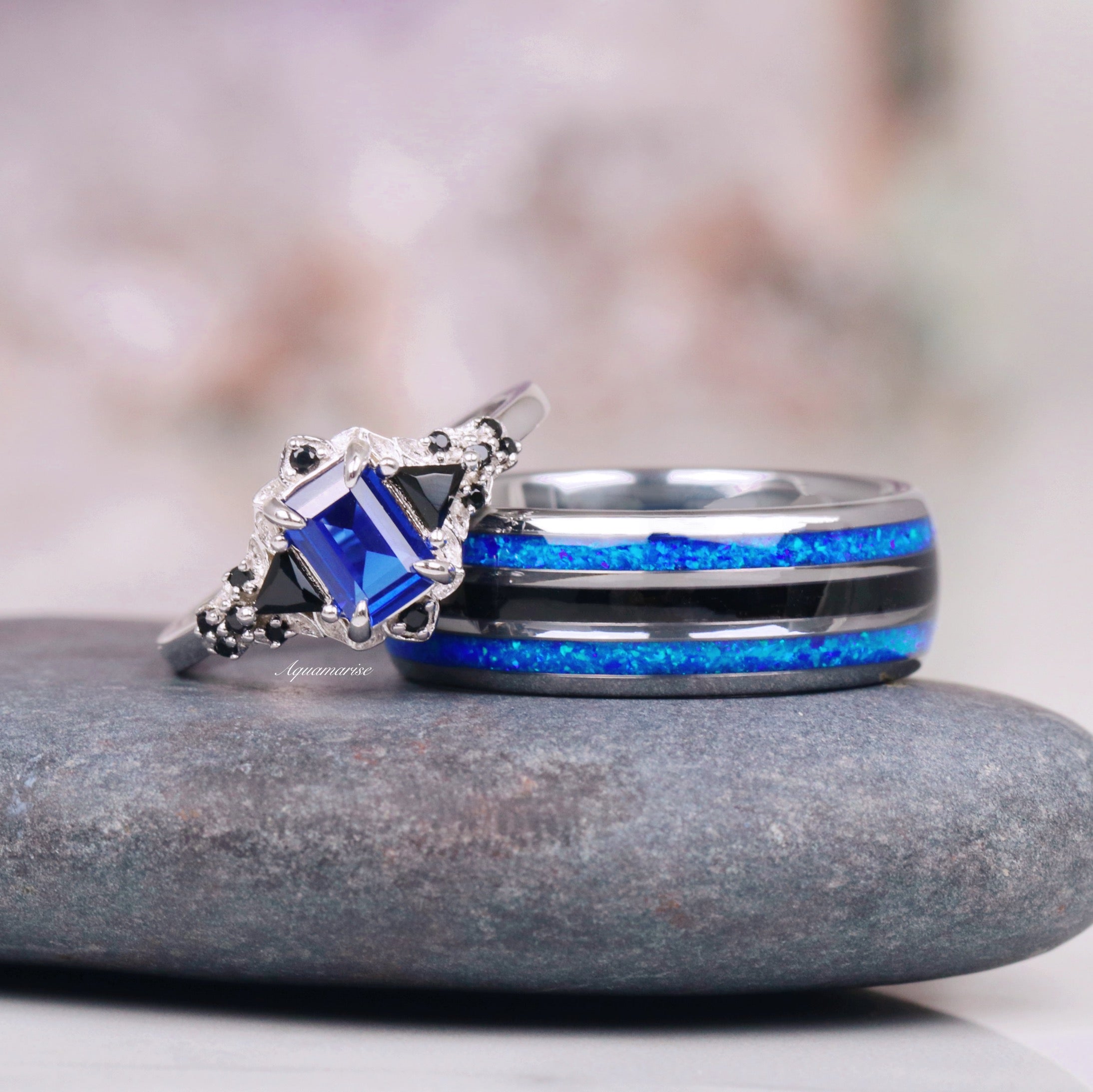 Embrace the allure of sophistication with the Blue Sapphire & Black Onyx Engagement Ring for Women. This exquisite piece is crafted from 14k White Gold, ensuring lasting brilliance and quality. The centerpiece features a captivating blue sapphire, the radiant September birthstone, symbolizing wisdom and loyalty. Complementing the sapphire are striking black onyx accents, creating a stunning contrast that enhances its beauty.