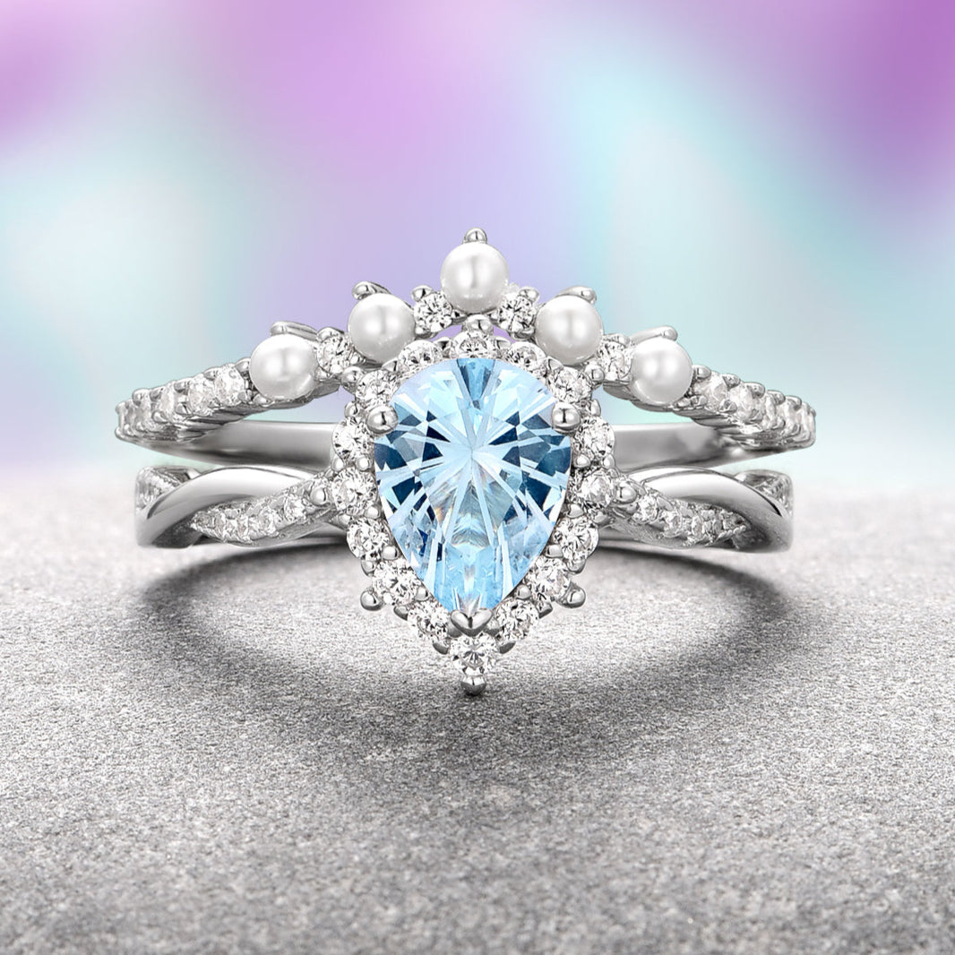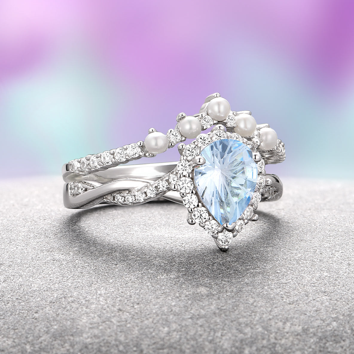 Introducing our enchanting Briar Aquamarine & Pearl Engagement Ring Set, a non-traditional engagement ring set inspired by fairytales and fantasy. Crafted with love and precision, this magical piece features a shimmering pear-shaped simulated aquamarine, nestled within a beautifully sculpted 14K White Gold setting.