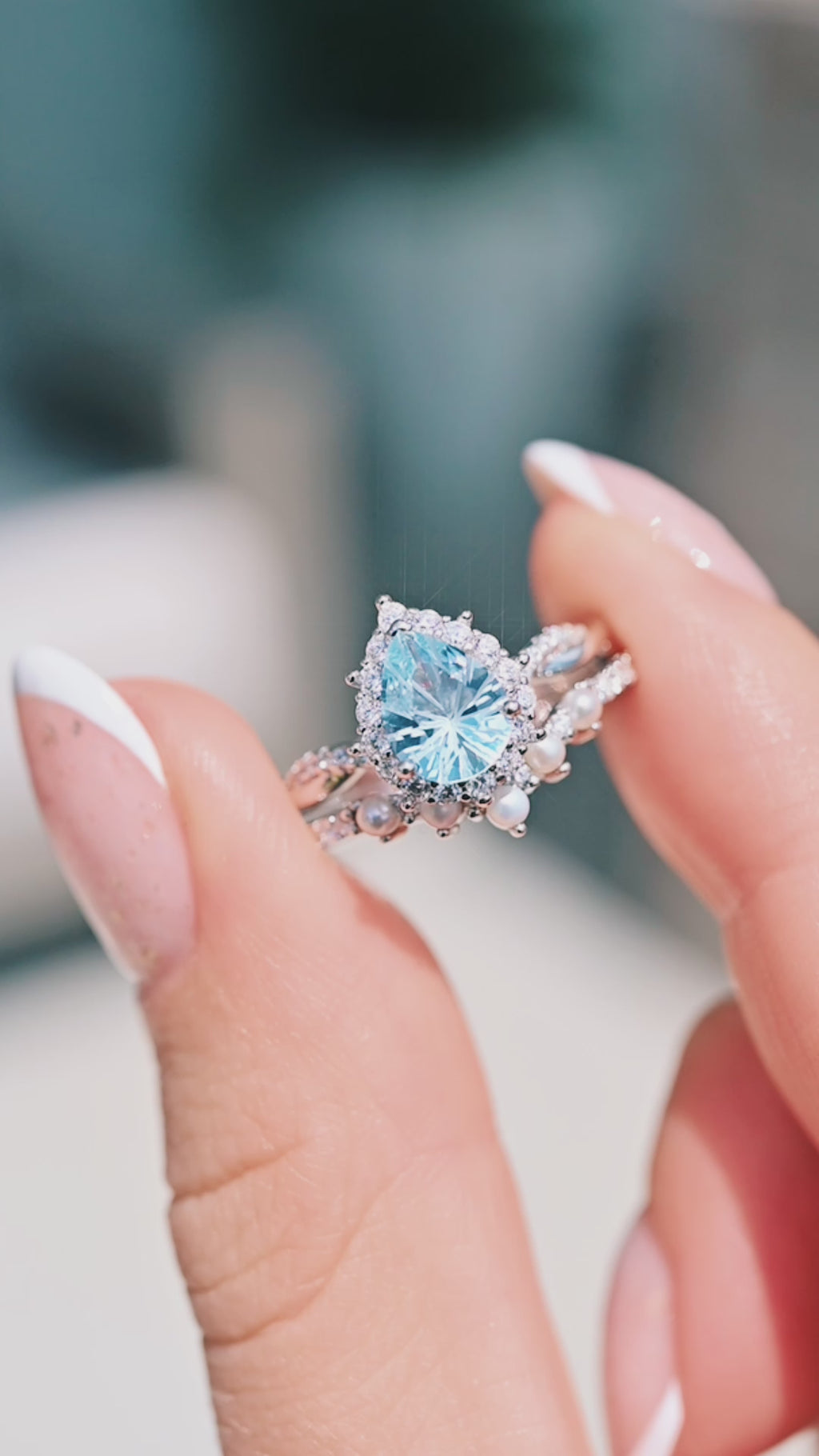 ►The tranquil aquamarine gemstone symbolizes clarity, harmony, and enduring love. Its soft, ocean-blue hue evokes calm and connection, representing a relationship filled with peace, trust, and emotional balance. Aquamarine is often associated with fairytale romance, making it the perfect gemstone for a fantasy-inspired love story.