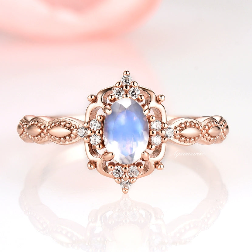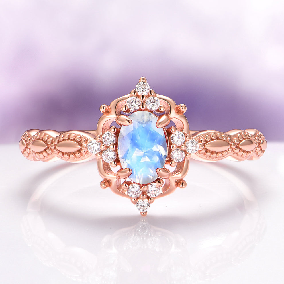 Ethereal and feminine, the Claire Moonstone Ring in 14K Solid Rose Gold features a glowing natural moonstone in a smooth cabochon cut, set in a vintage-inspired design. Accented with sparkling moissanite side stones and intricate rose gold detailing, this ring captures the soft magic of a fairytale romance.