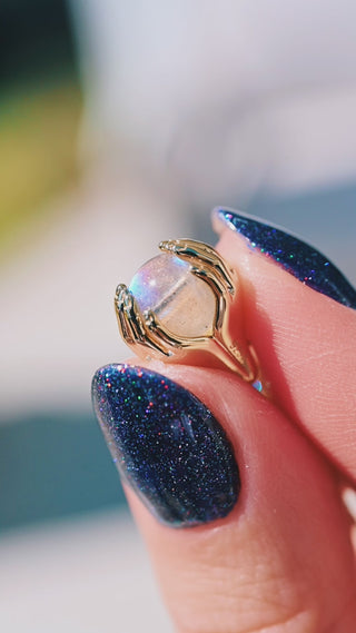 The Ethereal Hold Necklace represents strength, balance, and the magic of the cosmos. Handcrafted in 14K yellow gold vermeil, this pendant features gracefully sculpted hands delicately cradling a luminous natural labradorite gemstone—known for its mystical flashes of blue, green, and gold.