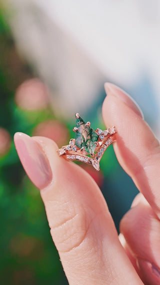 Introducing the Kite Green Moss Agate Engagement Ring Set, a vintage-inspired treasure that celebrates the harmony of nature and timeless romance. Handcrafted in solid 14K rose gold, this heirloom-quality set features a striking kite-cut natural moss agate, each stone showcasing unique green inclusions that make every piece one-of-a-kind. The elongated kite cut emphasizes the earthy beauty of the moss agate, while your choice of moissanite or natural diamonds provides subtle sparkle. A perfectly matched rose gold wedding band completes the set, creating a graceful symbol of unity and everlasting love. Distinctive yet enduring, this design is a meaningful reflection of a love story as unique as nature itself.