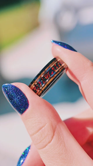 The vibrant red opal shimmers with fiery brilliance, while the deep galaxy blue sandstone reflects starlight with every movement. Together, they create a mesmerizing contrast framed by warm rose gold accents and a sleek two-tone tungsten body. The whiskey barrel inlay adds a grounding, organic element — a reminder of nature’s craftsmanship and timeless endurance.