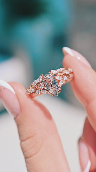 Embrace the magic of nature with this Salt and Pepper (Herkimer) Diamond Leaf Ring Set, a breathtaking fairy-inspired engagement or promise ring designed for dreamers and romantics. Crafted in 14K rose gold vermeil, this enchanting ring set features a stunning raw Herkimer quartz, known for its natural inclusions that create a beautiful salt-and-pepper effect. Delicate cubic zirconia diamonds accent the band, forming an intricate leaf and vine design, symbolizing growth, love, and eternity.