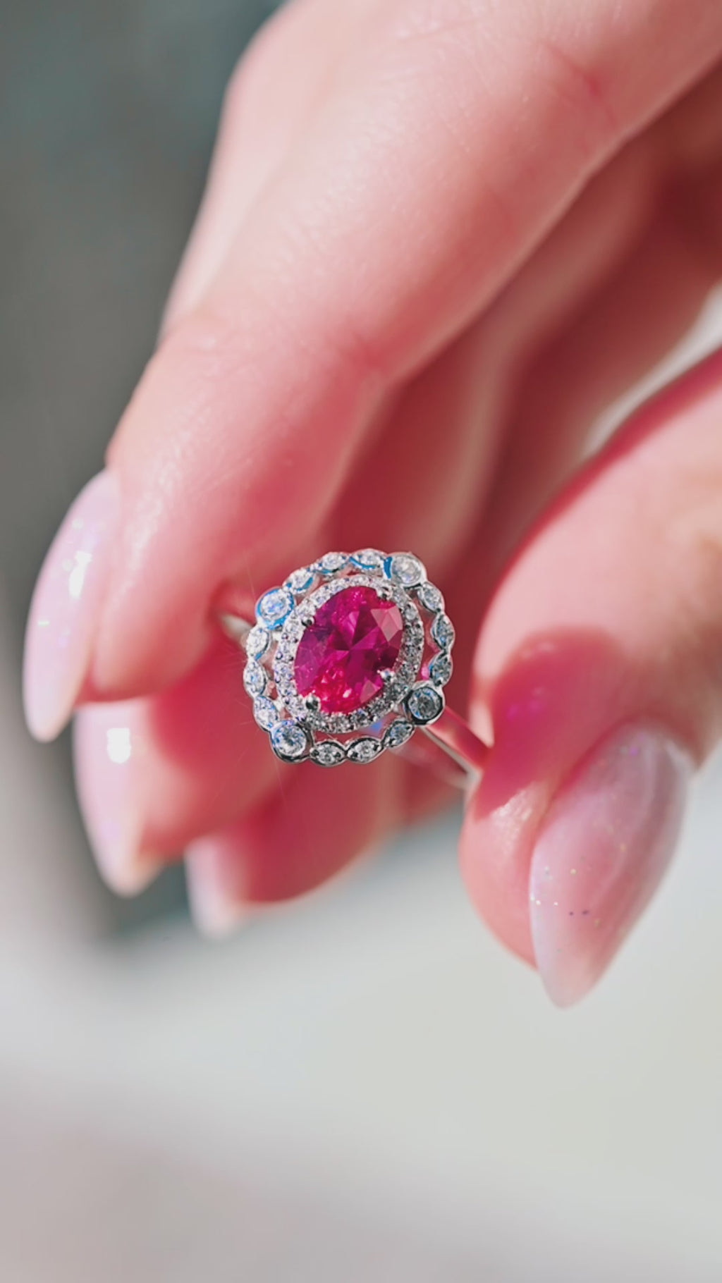 This romantic and refined Valentina Art Deco Ruby Ring in 14K Solid White Gold is a vintage-inspired design that blends elegance with timeless artistry. Featuring a brilliant lab-grown oval ruby, the vibrant fuchsia-pink hue is framed by intricate milgrain details and sparkling accents, bringing a playful yet elegant twist to classic Art Deco design. The cool luster of solid white gold enhances the gem’s vivid color, making this a striking choice for engagements, anniversaries, or one-of-a-kind gifts. Expertly handcrafted, the Valentina ring celebrates the energy and symbolism of ruby, long associated with passion, love, and vitality. Its graceful yet bold design is perfect for those drawn to vintage glamour with a colorful, modern edge.