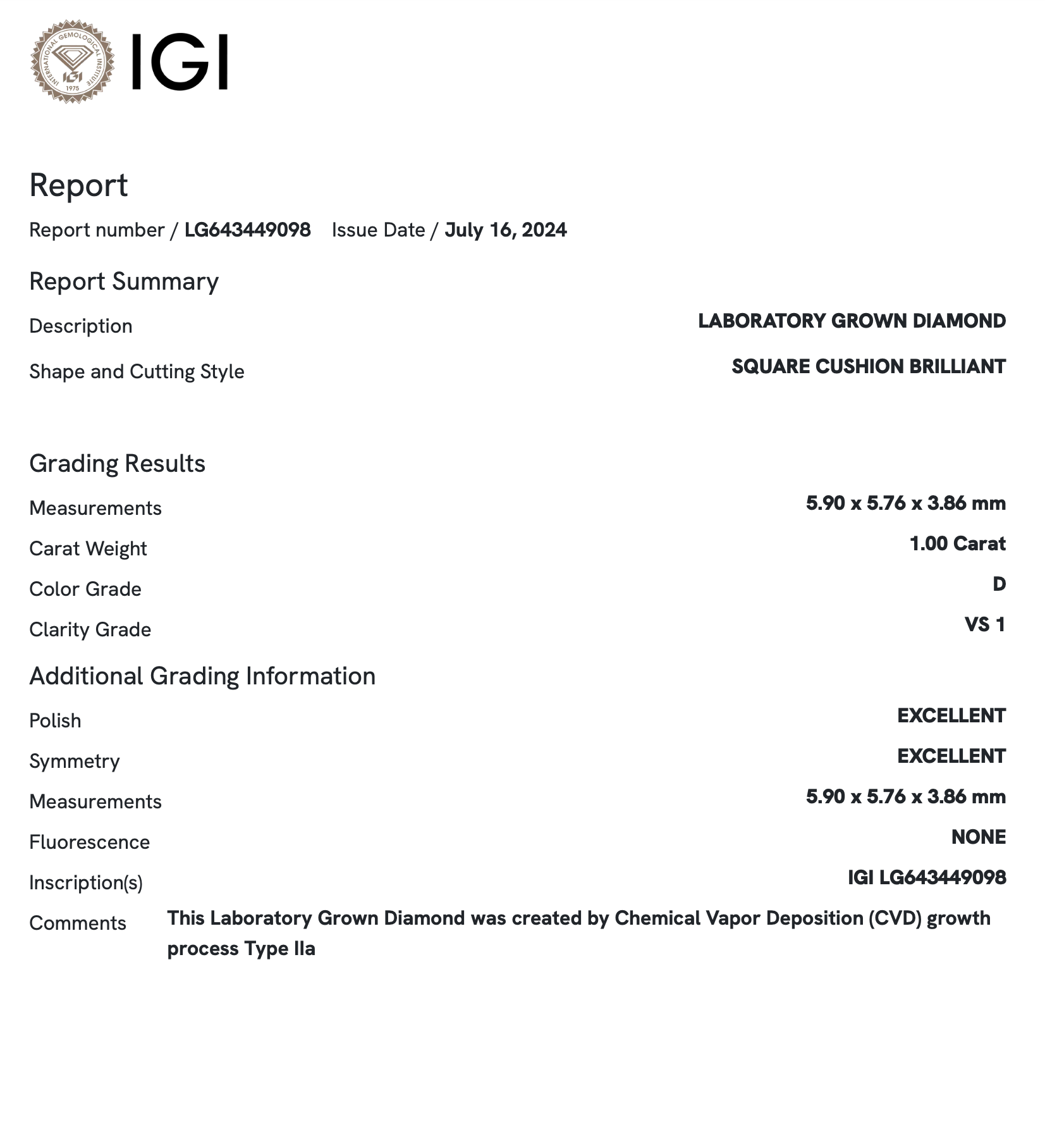 1.0 Carat Square Cushion Lab Grown Diamond (IGI)