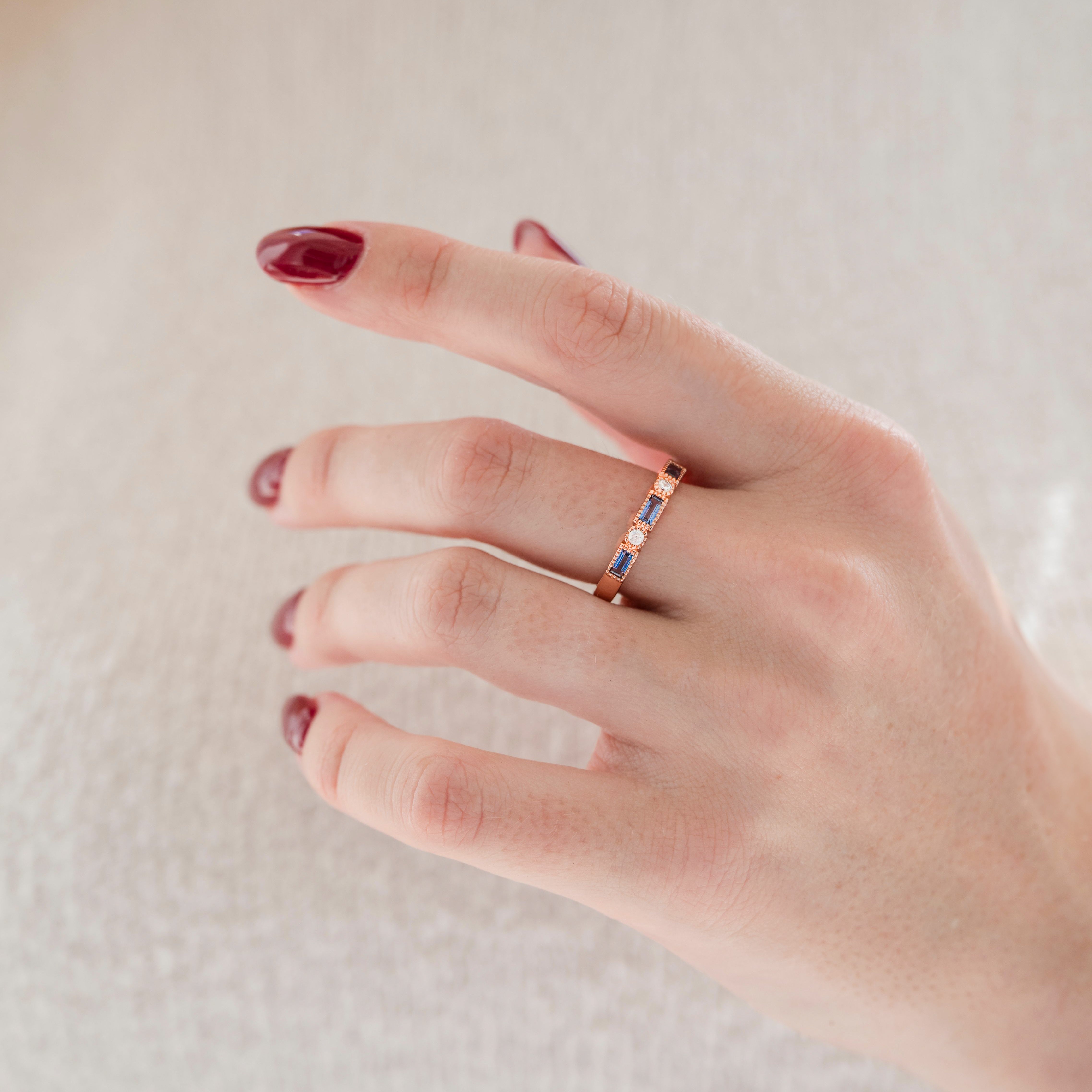 This gorgeous vintage-inspired Alexandrite ring captures timeless beauty with a touch of modern elegance. Crafted in 14K rose gold vermeil over 925 sterling silver, it features alternating lab-grown Alexandrite and cubic zirconiastones, creating a captivating play of color and sparkle.