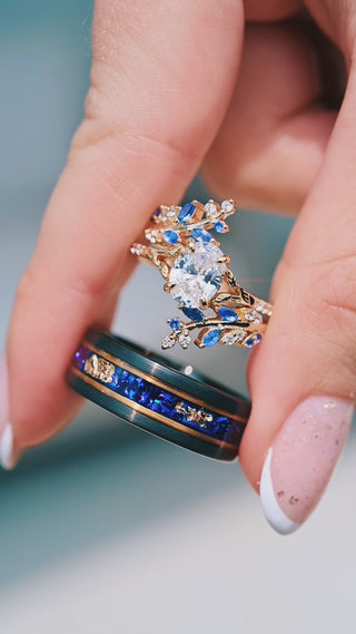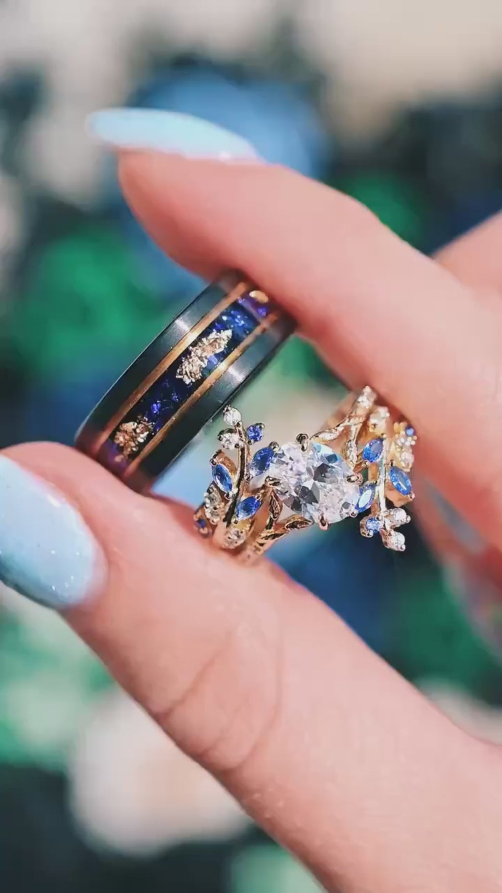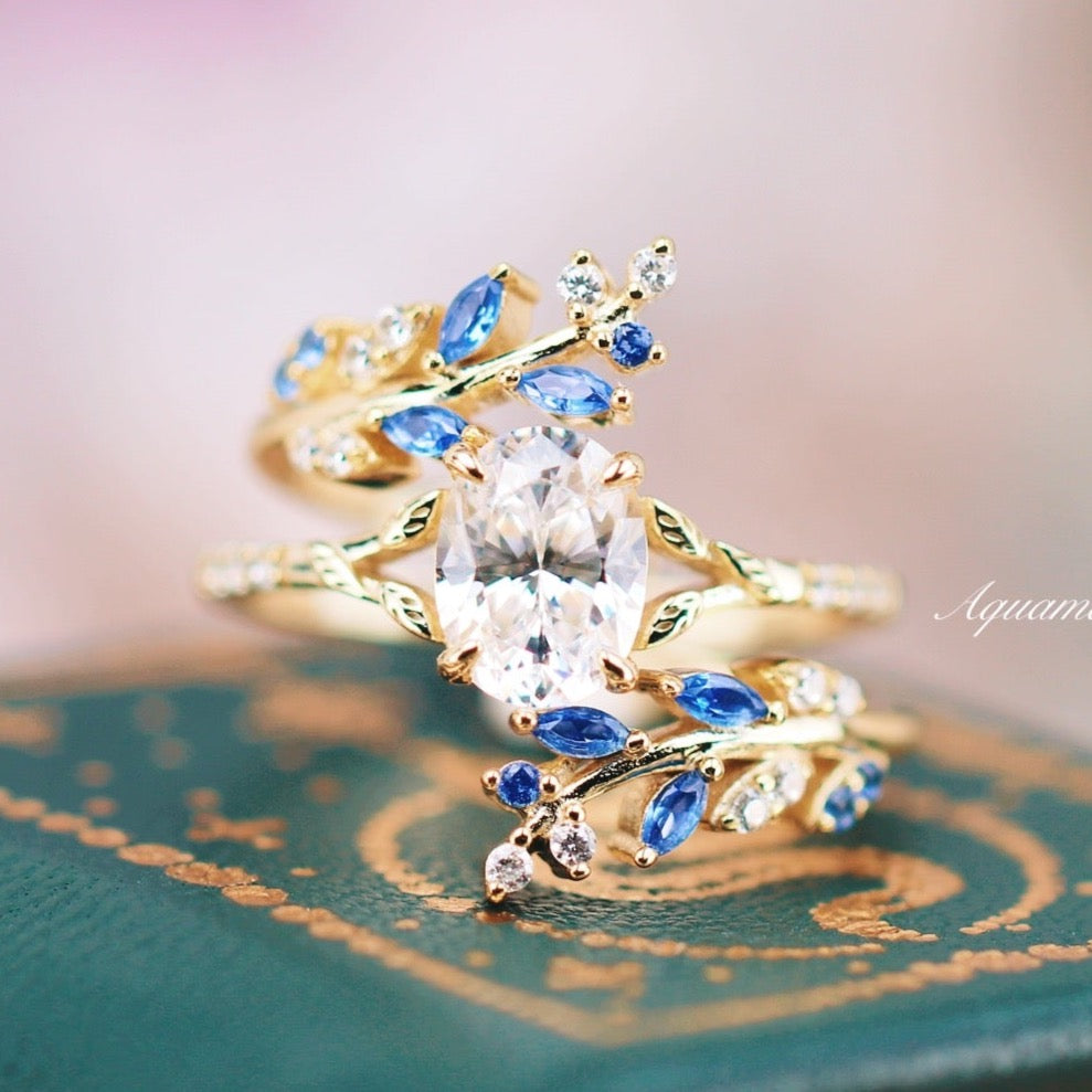 Embrace the fairy tale with the Blue Sapphire & Lab-Grown Diamond Leaf Engagement Ring Set, where every glance at your hand brings a reminder of love's enduring magic.