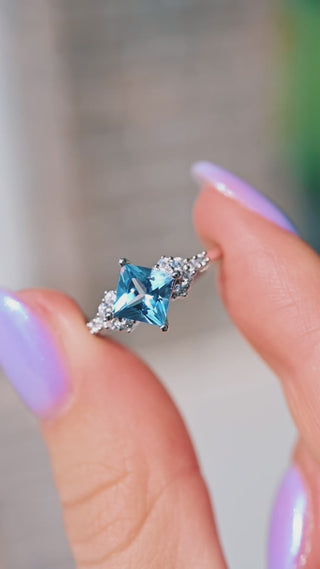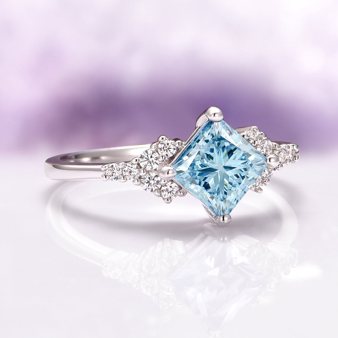 Introducing the Ellie Princess Cut Blue Diamond Engagement Ring, a delicate and dainty design that radiates romance and modern elegance. Handcrafted in solid 14K white gold, this enchanting piece features a princess-cut lab-grown blue diamond, admired for its vivid hue symbolizing loyalty, strength, and everlasting love. The refined setting highlights the center stone’s brilliance with sparkling colorless lab-grown diamond accents, adding graceful radiance and timeless sophistication. Lightweight yet elegant, this ring embodies understated beauty and is designed to be cherished for a lifetime.