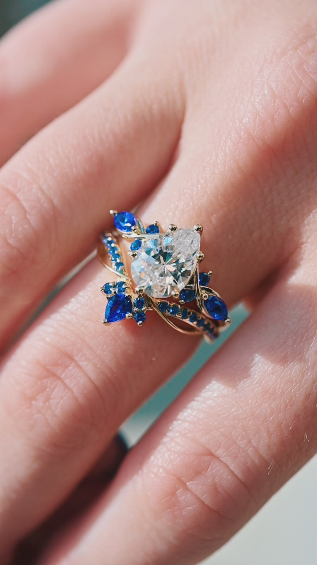 ►The centerpiece features a brilliant lab-grown diamond, renowned for its exceptional sparkle, clarity, and fire. Flanking the center stone are vibrant lab-grown blue sapphire accents, cherished for their rich royal hue and symbolism of wisdom, loyalty, and eternal love. The white gold band is intricately adorned with delicate, nature-inspired details, evoking the ethereal beauty of a fairy-tale forest.